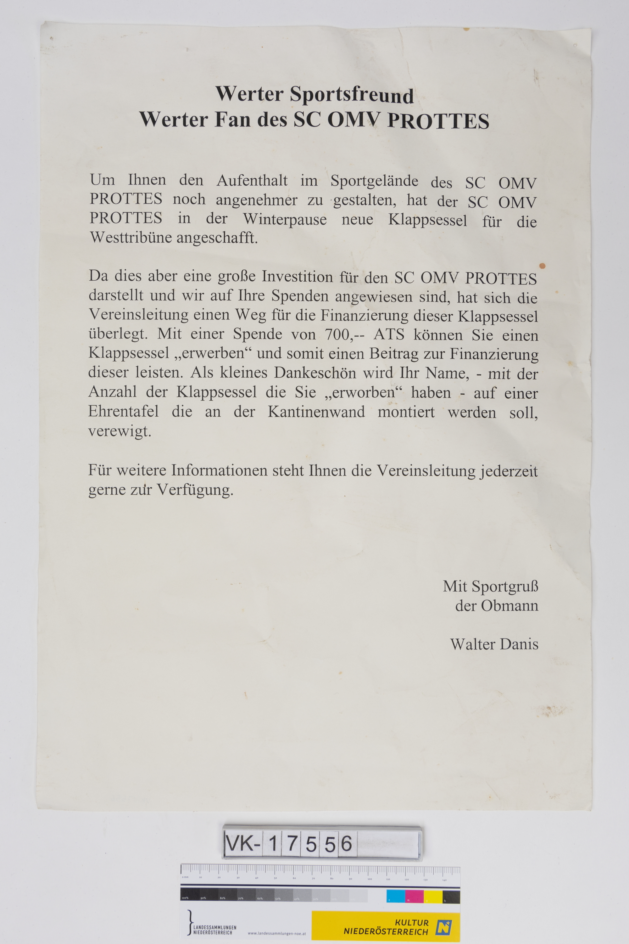 Kundmachung des SC OMV PROTTES über einen Spendenaufruf.