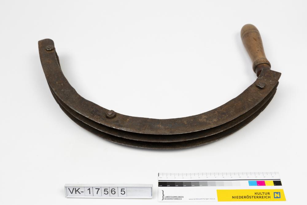 Wiegemesser mit drei gebogenen Klingen, die mit Gewindestangen mit Abstand zueinander verschraubt sind. An einem Ende hat das Messer einen gedrechselten Holzgriff.