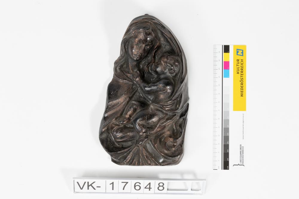 Aus Gips gegossene und lackiertes Relief: Maria mit Kind.