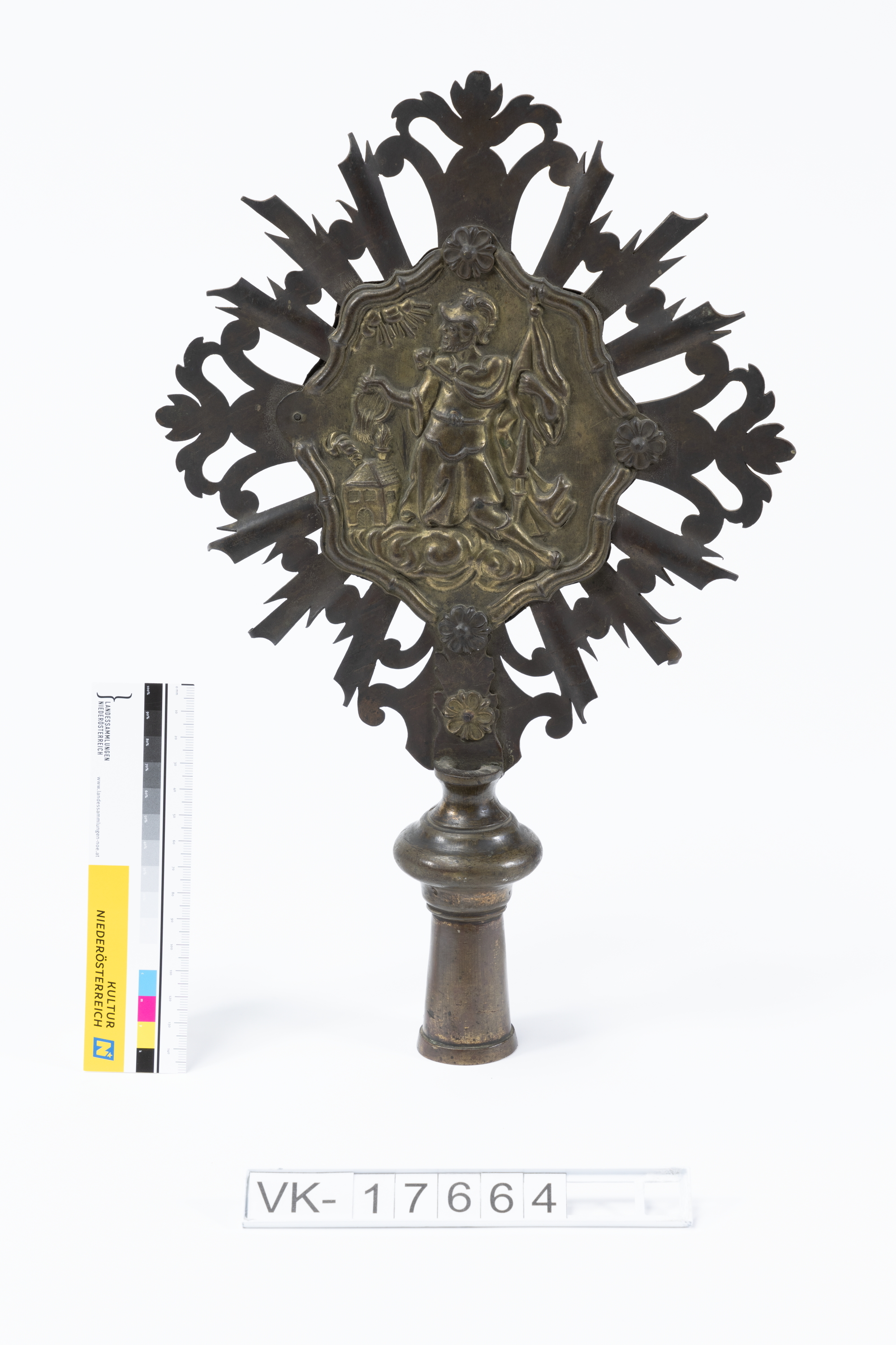 Fahnenspitze mit Tülle, Strahlenkranz aus Blech und zwei in Blech geprägten Reliefs: Auf der einen Seite ist der Hl. Florian dargestellt, auf der anderen Seite eine Monstranz.