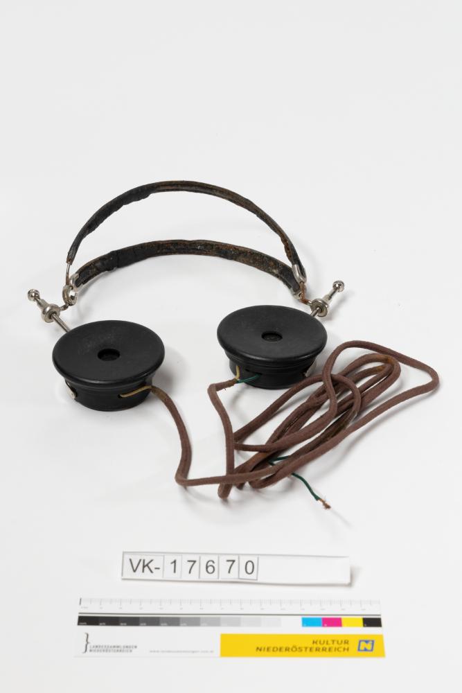 Ein Paar Kopfhörer mit lederbezogenem Bügel und textilummantelten Kabeln. Auf den beiden Hörern ist die Impedanz aufgedruckt: 2000 Ohm.