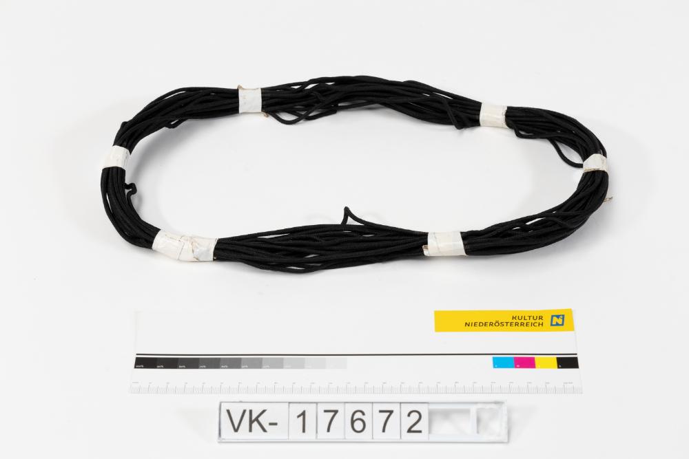 Textilummanteltes schwarzes Kabel. Das Kabel ist aufgerollt und mit weißem Isolierband zusammen gebunden.