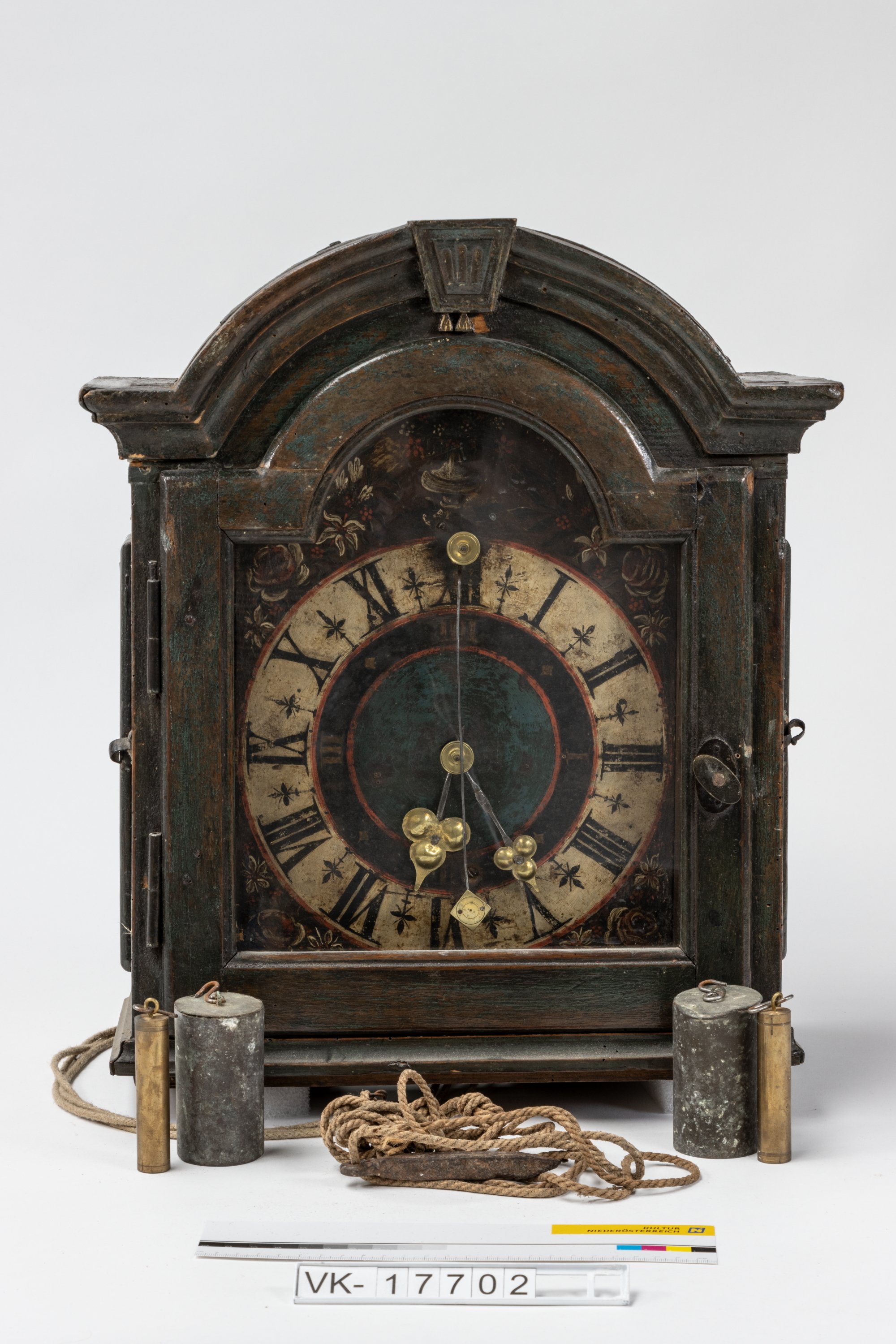 Wanduhr in einem Holzkasten (VK-17702a), mit mehrfärbig bemaltem Zifferblatt (florale Motive), vier Gewichten (VK-17702c-f) und einem Pendel (VK-17702b). Die Uhr hat vorne und jeweils seitlich ein Glastürchen.