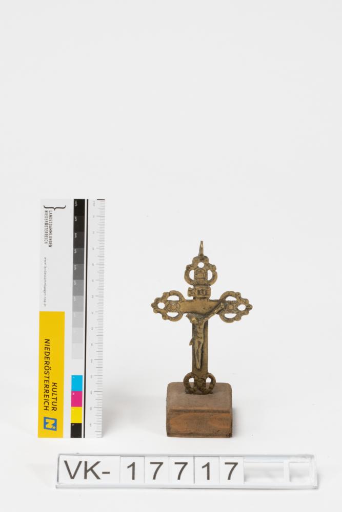 Aus Messing gegossenes Kruzifix mit durchbrochenen dreipassförmigen Enden auf einem quaderförmigen Holzsockel.