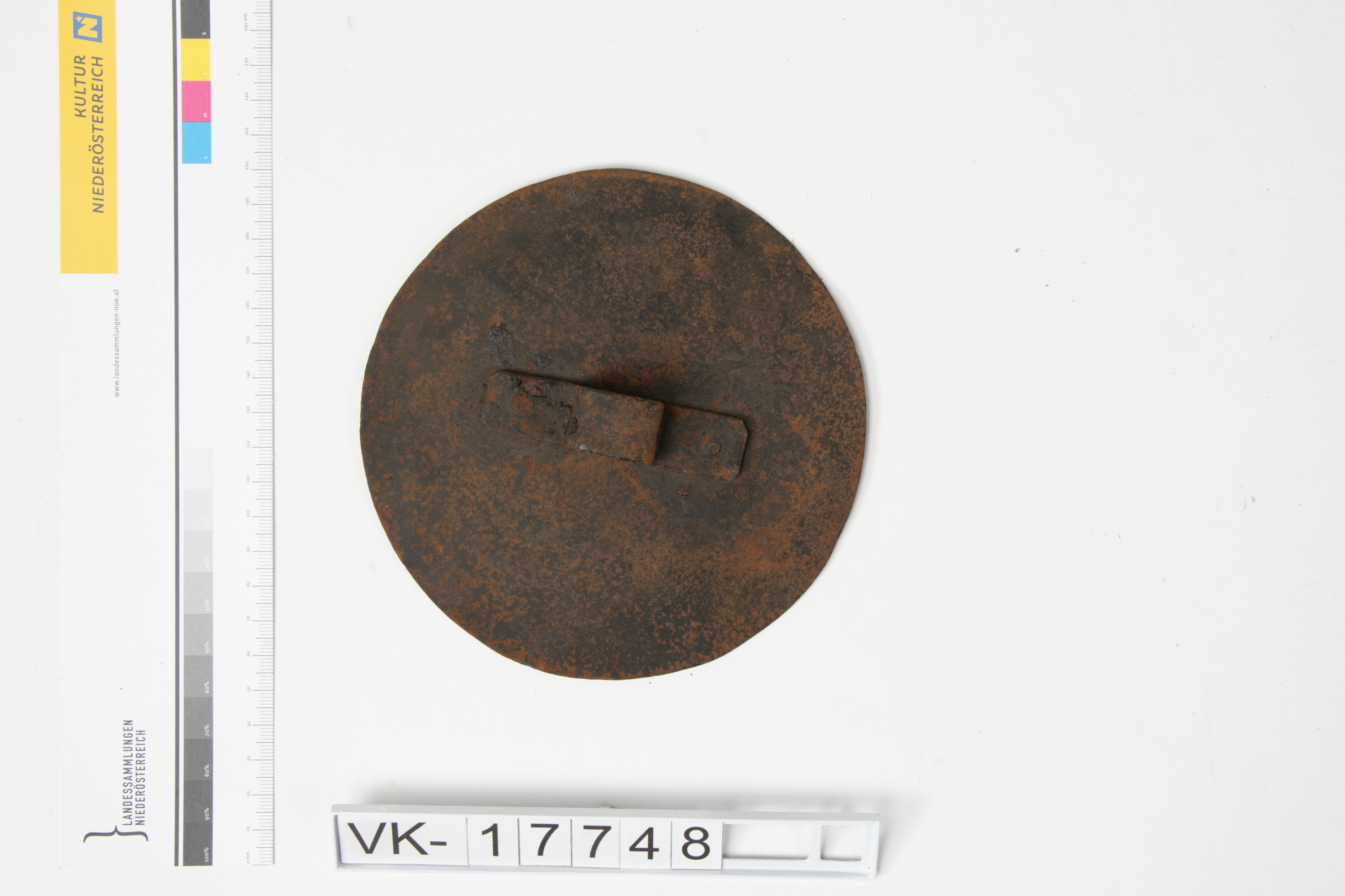 Flacher Deckel mit einem aufgenieteten Henkel.