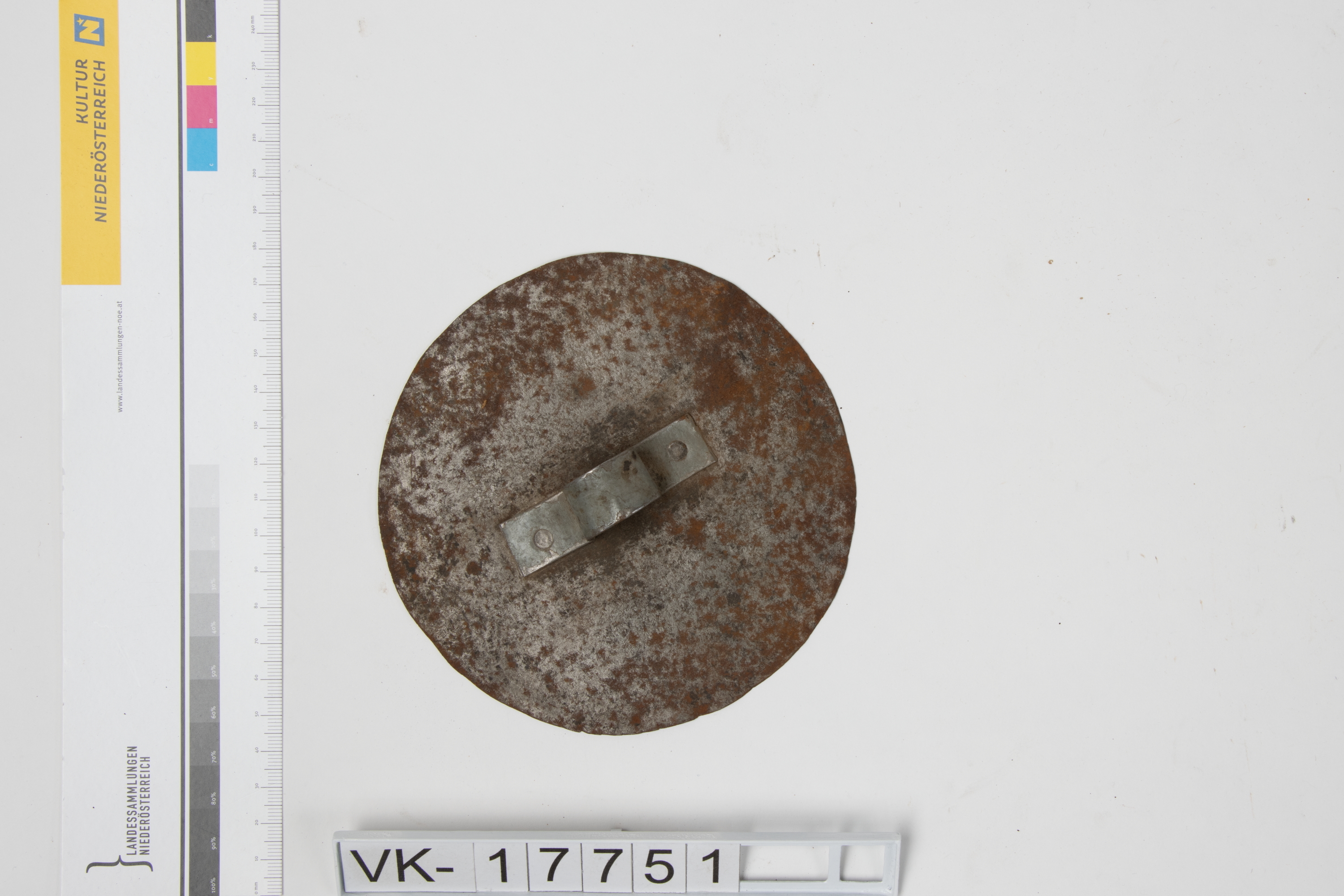 Flacher Deckel mit einem aufgenieteten Henkel.