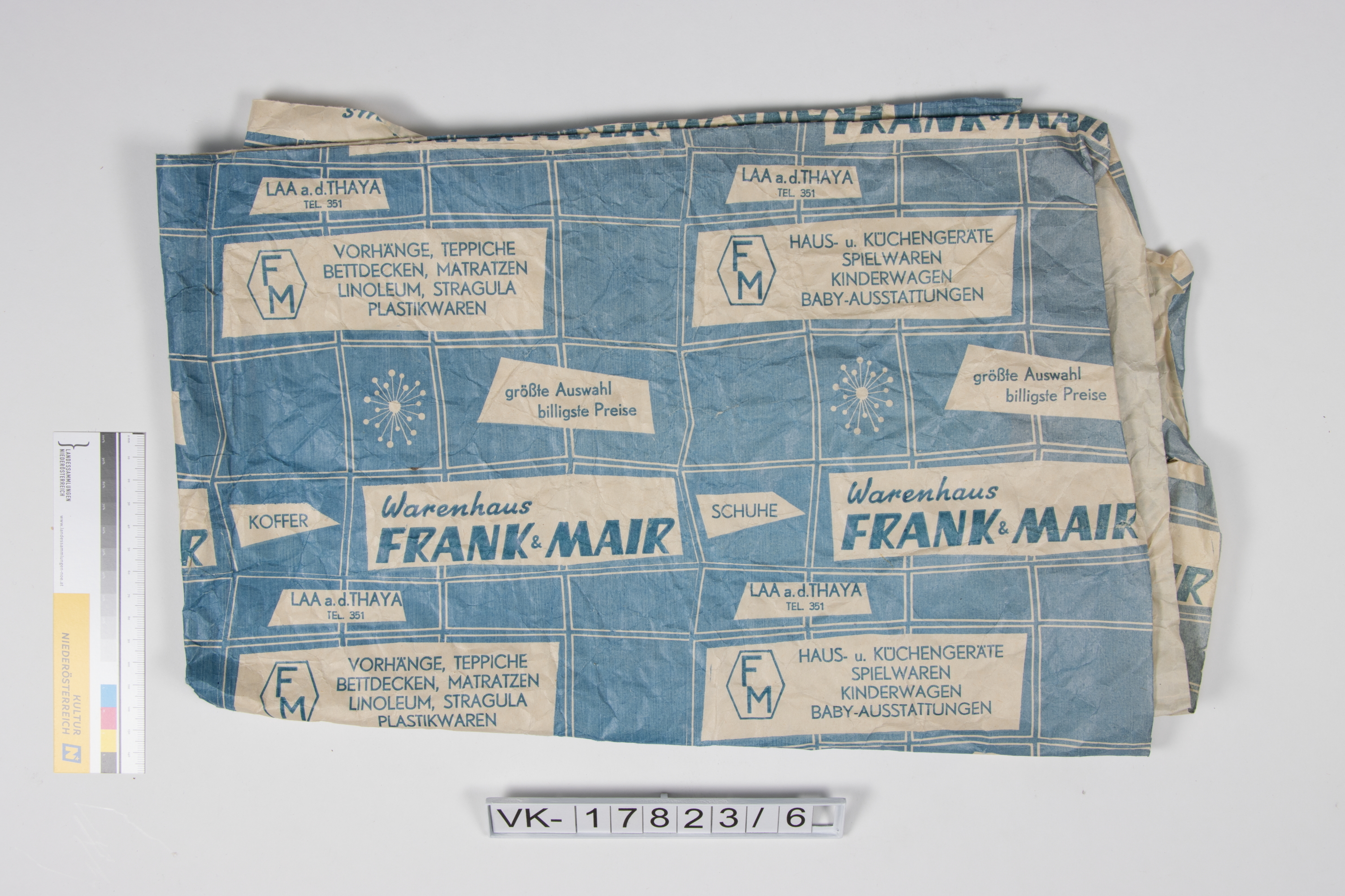 Ein Bogen Packpapier, blau bedruckt, mit Karomuster und Aufschrift: "FM Warenhaus FRANK & MAIR LAA a.d. THAYA TEL. 351".