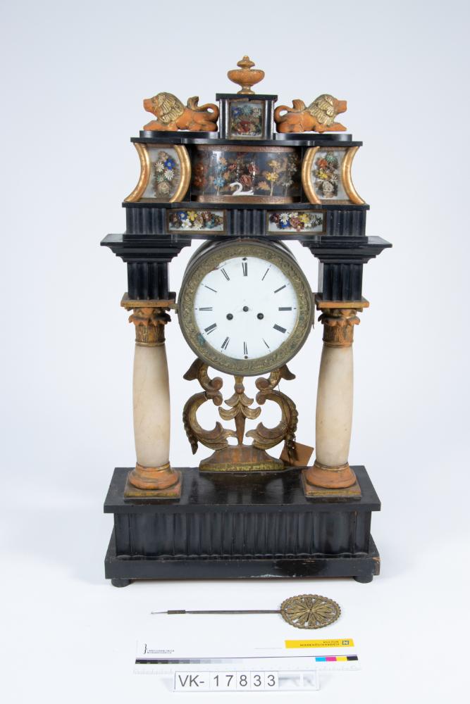 Standuhr mit weißem Zifferblatt (mit römischen Ziffern) in einem Rahmen aus Holz mit Marmorsäulchen (VK-17833a), dessen oberer Abschluss durch zwei geschnitzte Löwen gebildet wird (VK-17833b und VK-17833c). Der obere Bereich des Rahmens ist mit Glasfensterchen, hinter denen Papierblumenarrangements und ein Schwan angebracht sind gestaltet. Die Uhr hat ein Messingpendel in Strahlenform (VK-17833d).