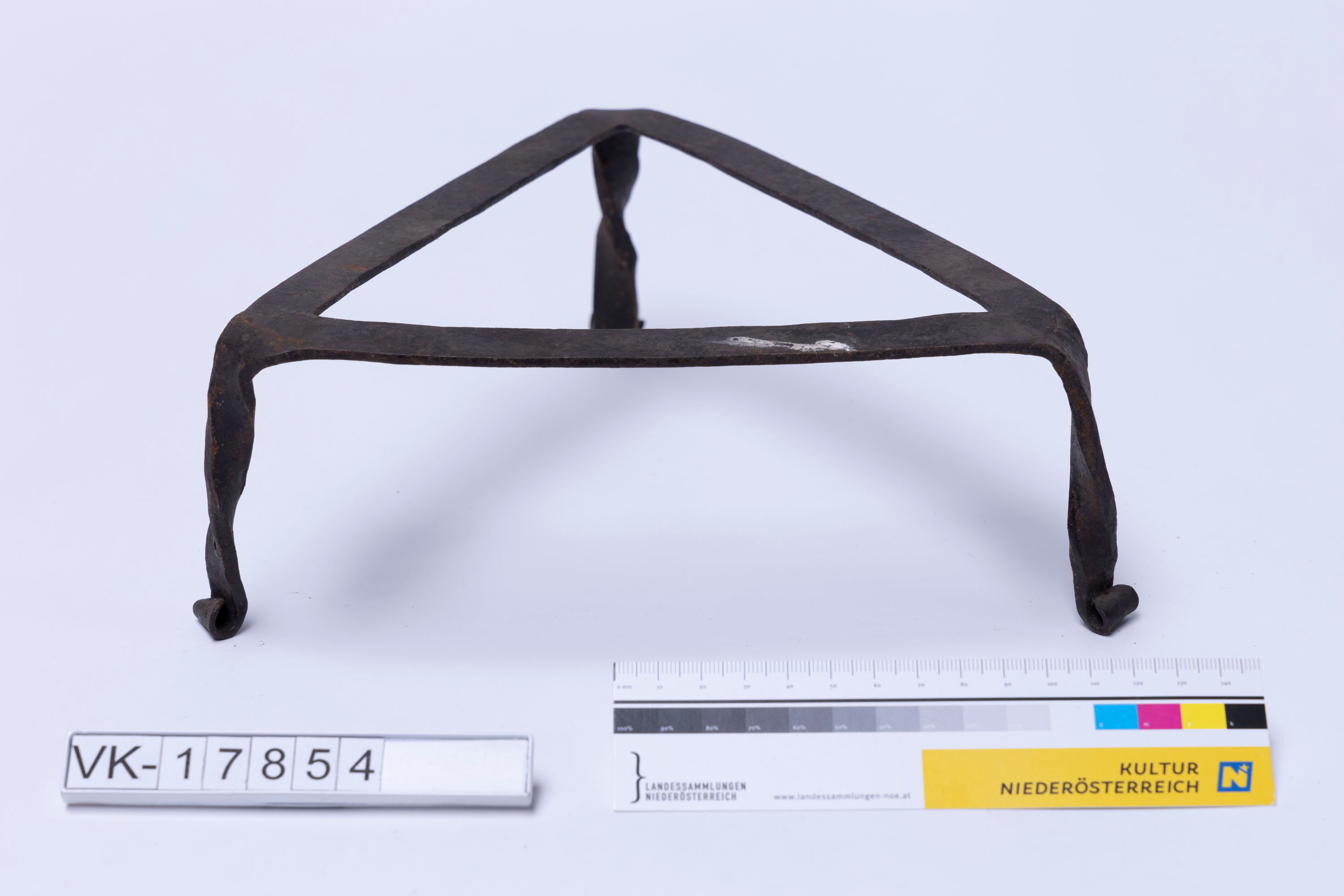 Schmiedeeiserner, dreieckiger Untersetzer mit drei gedrehten Füßen.