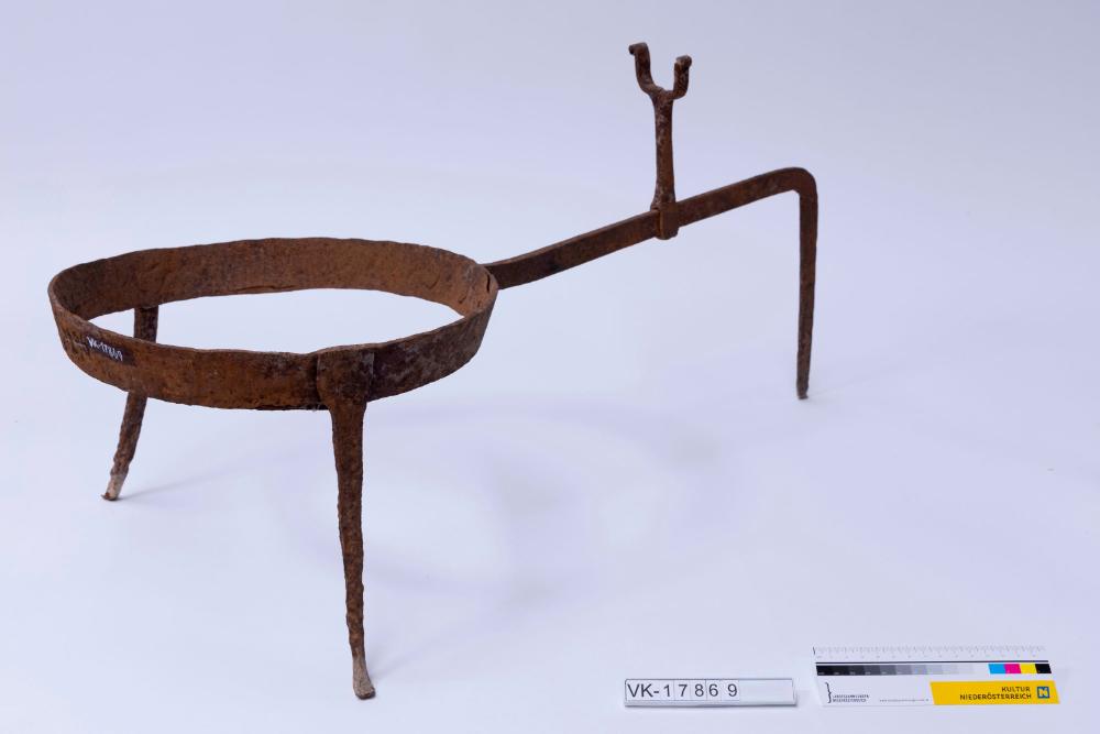 Pfannenuntersetzer (Pfannenknecht) mit runder Auflage und einem verlängerten Stiel, auf dem die gabelförmige Stielhalterung befestigt ist.