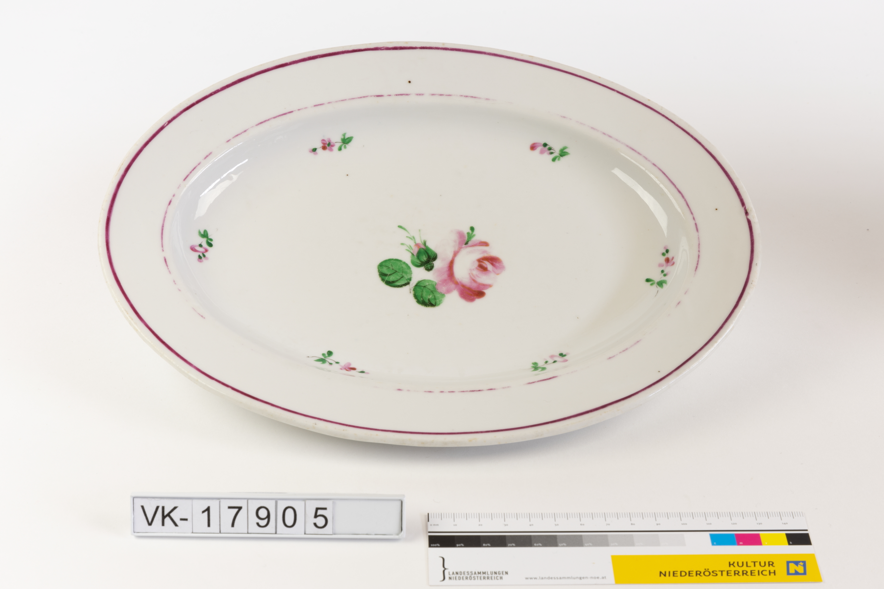 Ovaler, weiß glasierter Teller mit rosa Rand und Blütendekor.