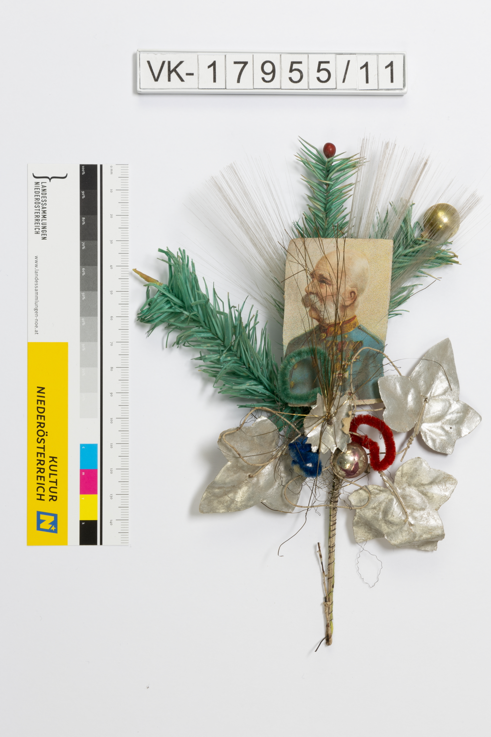 Rekrutensträußchen mit silbernen Blättern, grünen Zweigen, zwei Glaskugeln und einem aufgeklebten mehrfärbigen Portrait des Kaisers Franz Josef.