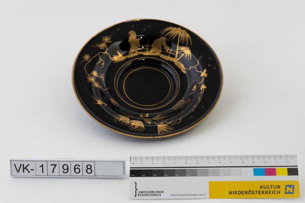 Kleiner Teller aus schwarzem Glas mit sehr breiter, bemalter Fahne. Die goldene Bemalung zeigt asiatische Motive mit zwei Personen und Pflanzen.