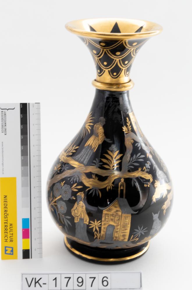 Bauchige Vase aus schwarzem Glas mit asiatischen Motiven.