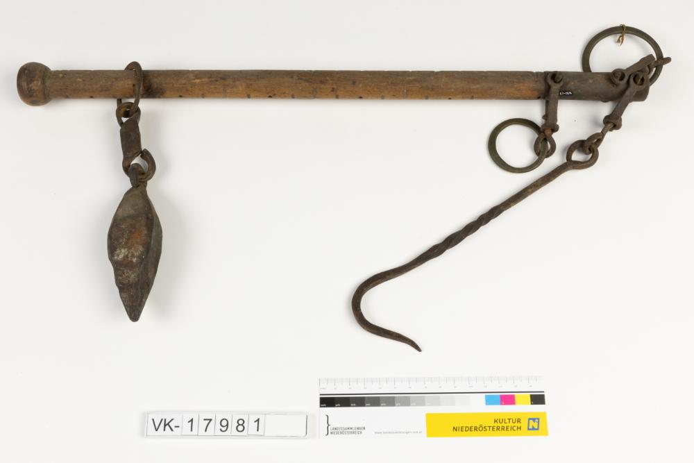 Laufgewichtswaage aus Holz mit Metallbeschlägen, einem Eisengewicht und einem Eisenhaken. Die Skala ist in die Holzstange eingeschnitzt.