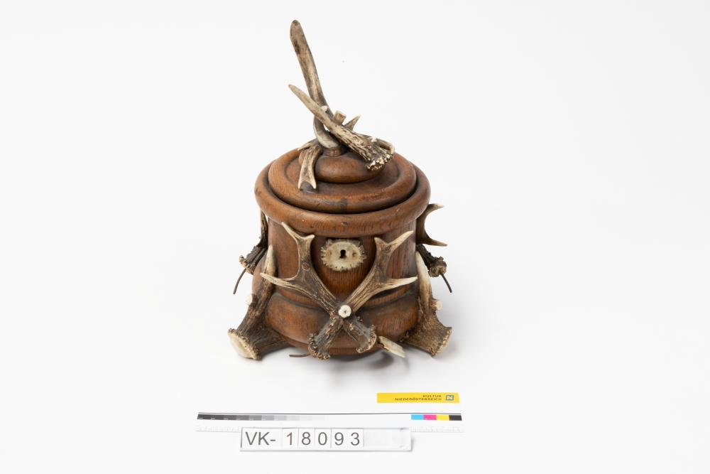 Holzdose, mit Geweihstangen und Wildschweinzähnen verziert. Die drei Füße werden ebenfalls von Geweihteilen gebildet. Der Klappdeckel ist mit einem Schloss versehen.