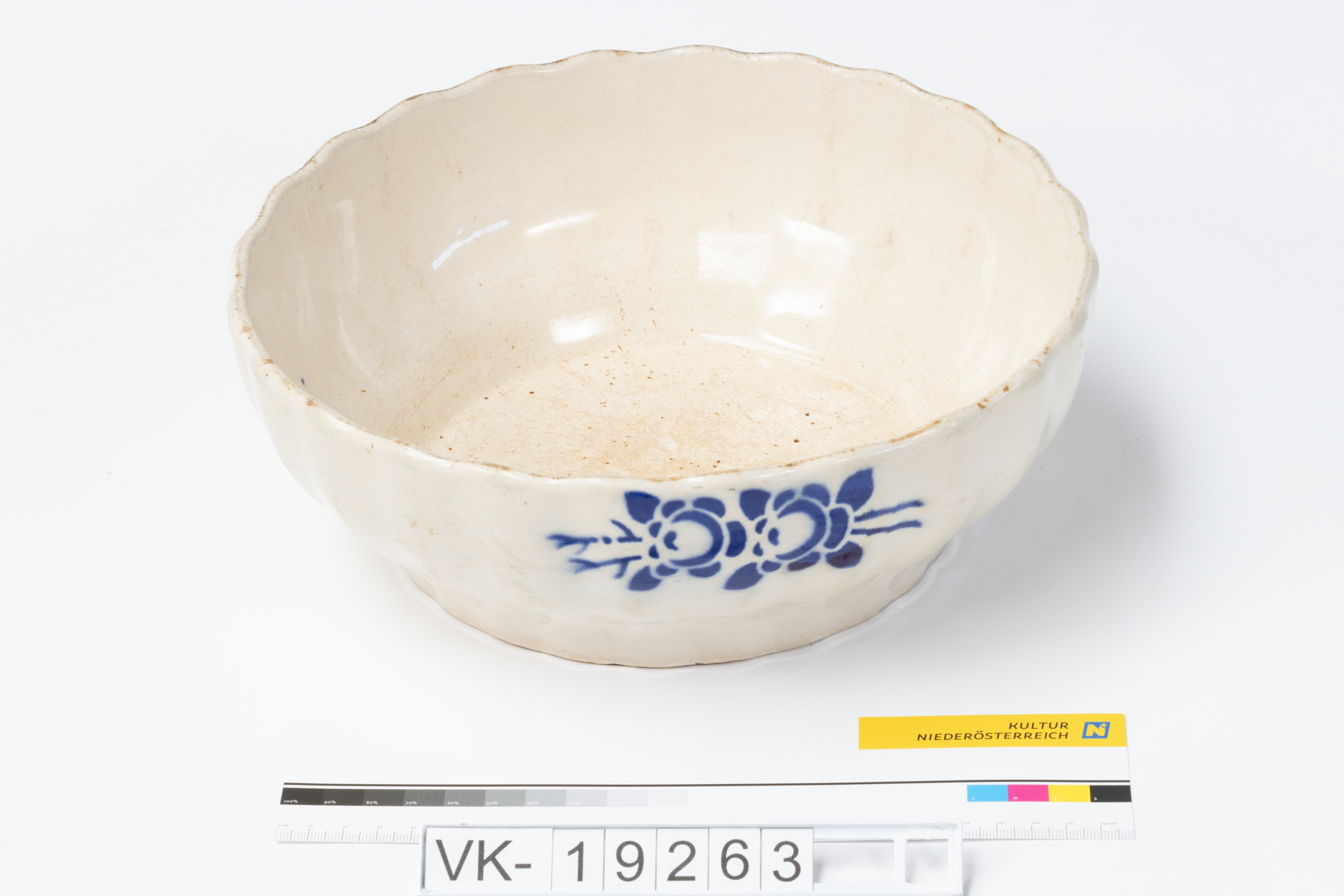 Weiß glasierte Schüssel mit leicht gewellter Wandung und einfachen blauen Blütenmotiven. Am Boden befindet sich die Herstellermarke mit einem Schwan und der Aufschrift: "WILHELMSBURG MADE IN AUSTRIA".