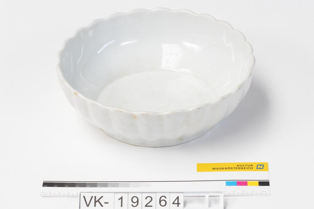Weiß glasierte Schüssel mit leicht gewellter Wandung.
