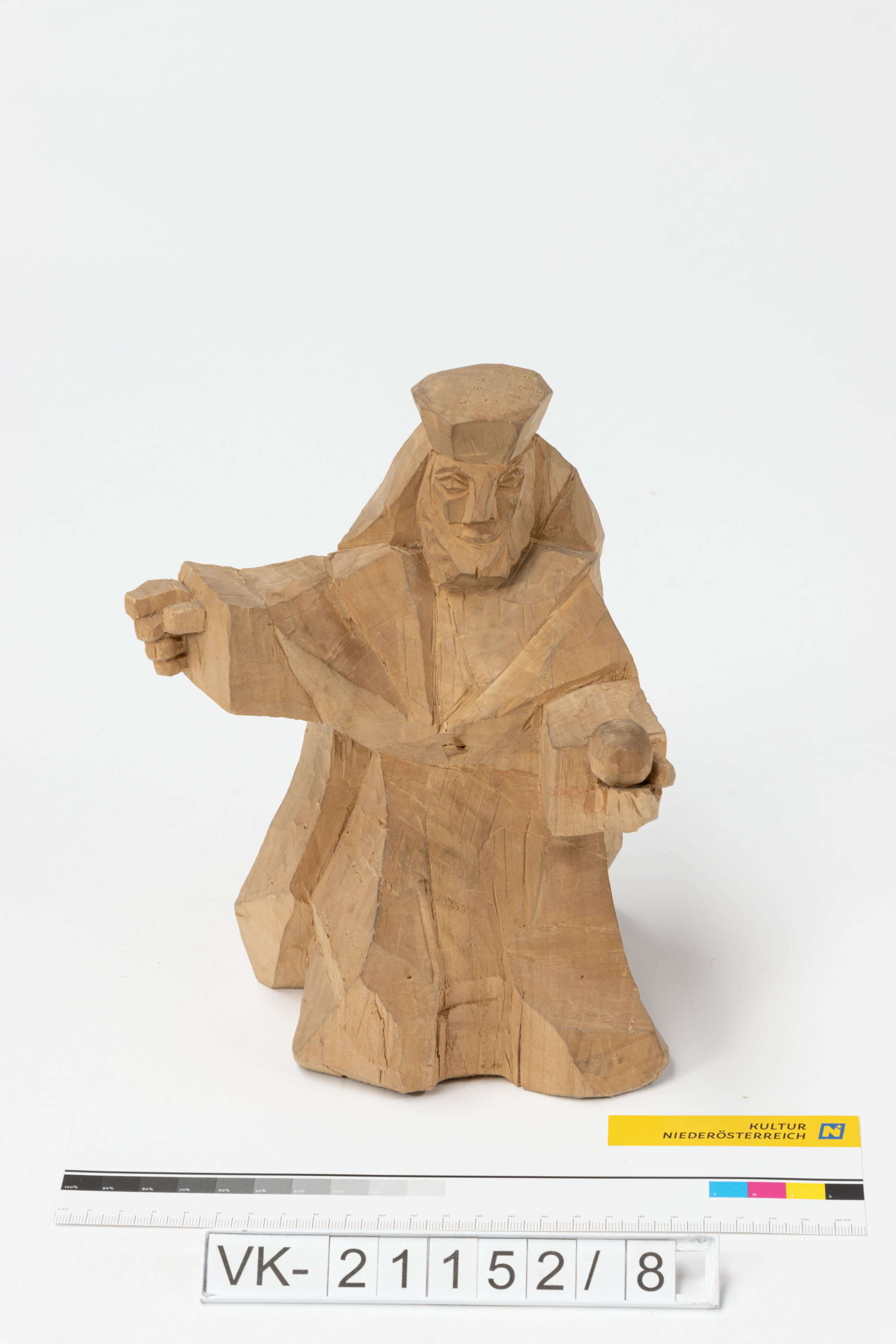 Grob geschnitzte hölzerne Krippenfigur: Mann (König), kniend mit einer Kugel in einer Hand. Teil der Hl. drei Könige.