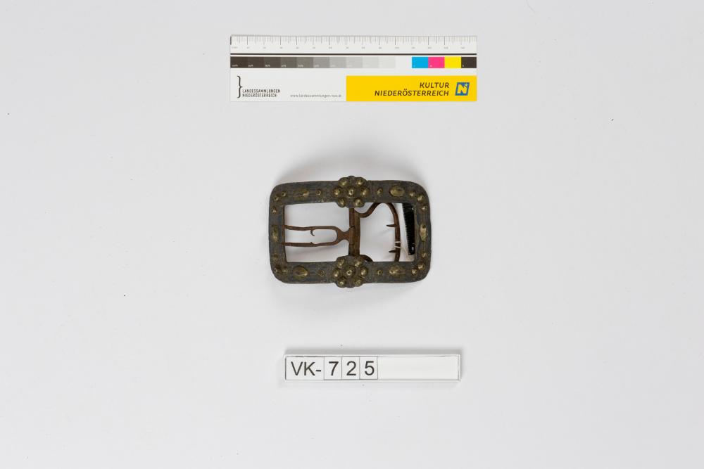 Schuhschnalle mit aufgenieteten Messingzierelementen und zwei Schließelementen, eines mit kurzen und eines mit langen Dornen. Die Schuhschnalle wird im Inventarbuch Gürtelschließe bezeichnet, was aufgrund der starken Wölbung unwahrscheinlich ist.