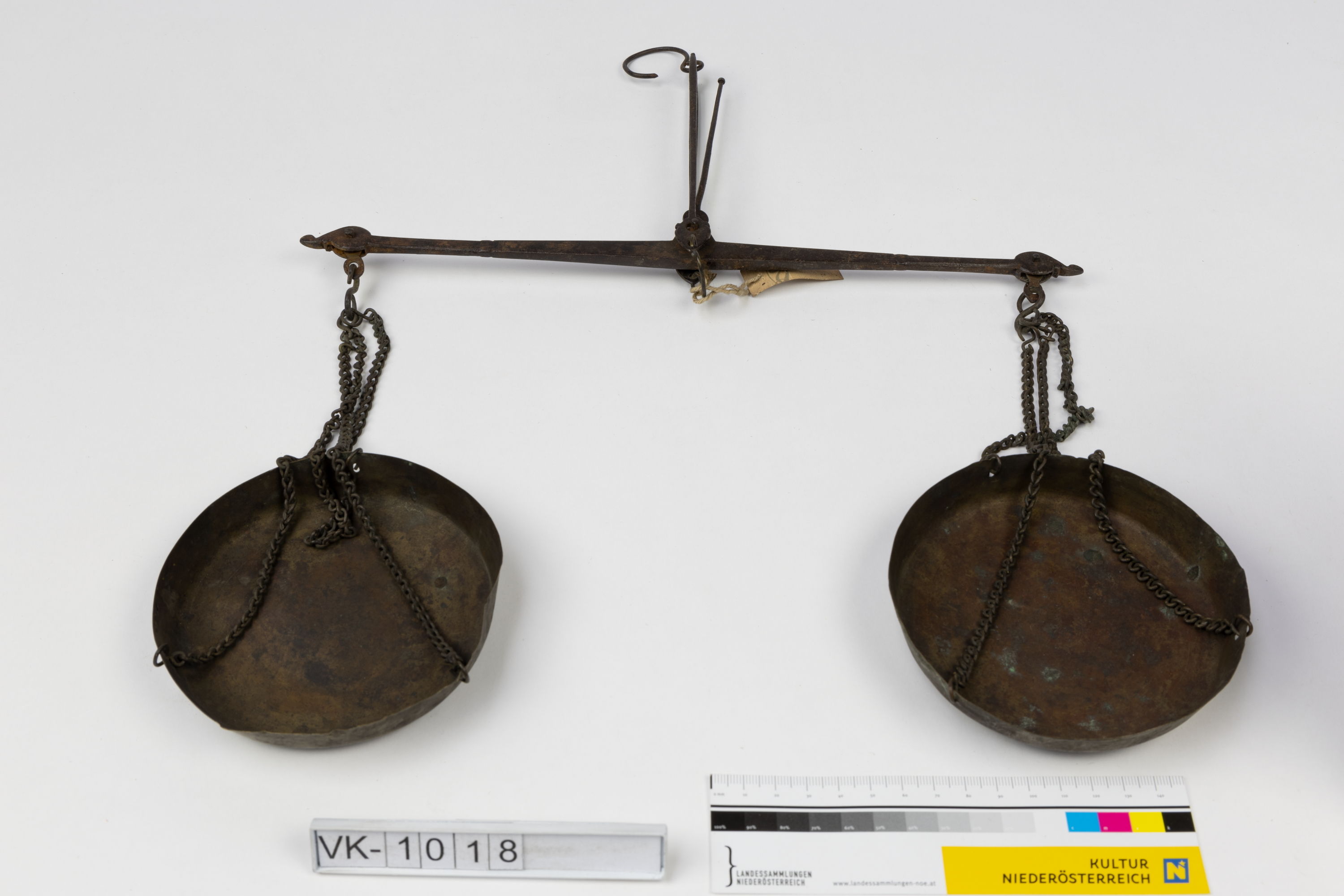 Kleine Balkenwaage aus Metall mit zwei mittels Kettchen aufgehängten Waagschalen aus Messing.