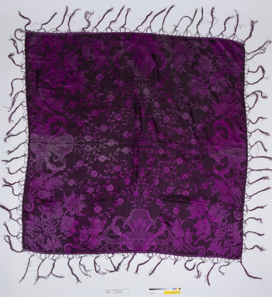 Großes dunkelviolettes Tuch mit hellviolettem Muster (Ranken, Blüten, Blattwerk) und violetten geknüpften Fransen.