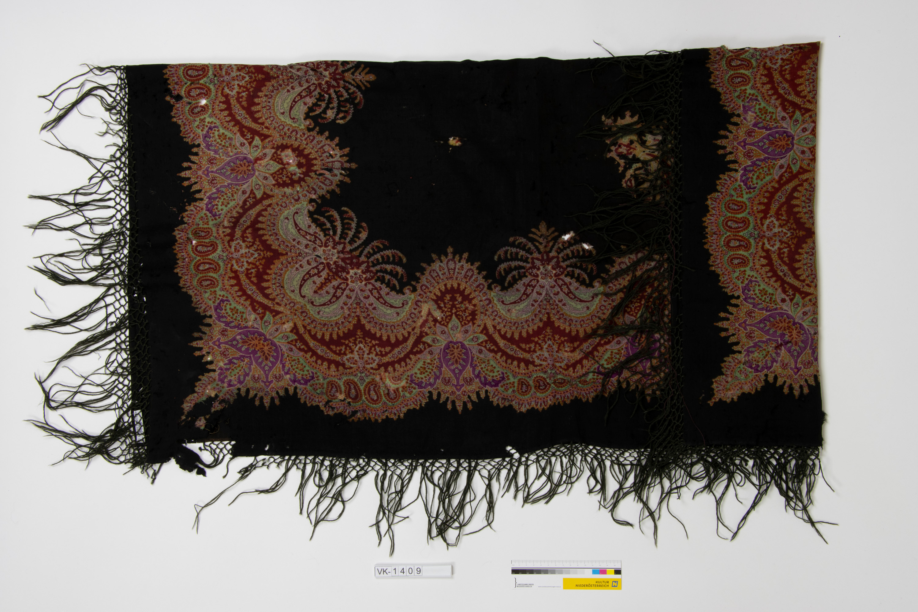 Schultertuch aus Kaschmir mit schwarzer Grundfarbe und einer rosa, violett und grün gestalteten Arabeskenborte. Die Wollfransen sind geknüpft und vernetzt.