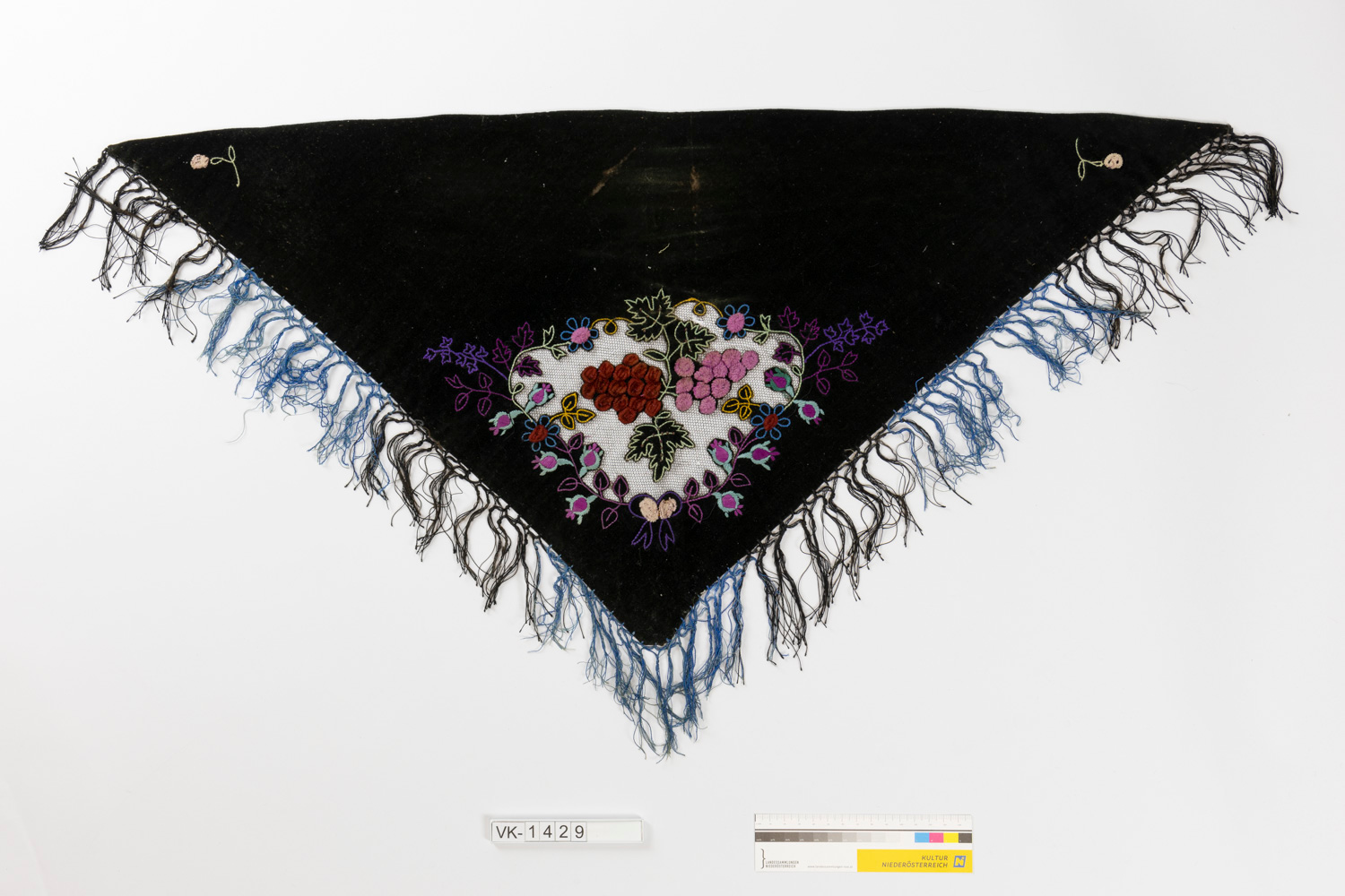 Dreieckiges Schultertuch aus Baumwollsamt mit Blütenmotiven in den Ecken und einem ausgeschnittenen Mittelmotiv, das mit Tüll unterlegt ist (rosa und rote Weintrauben mit Chenillebändern). Die beiden kürzeren Seiten haben schwarze und blaue geknüpfte und vernetzte Fransen.
