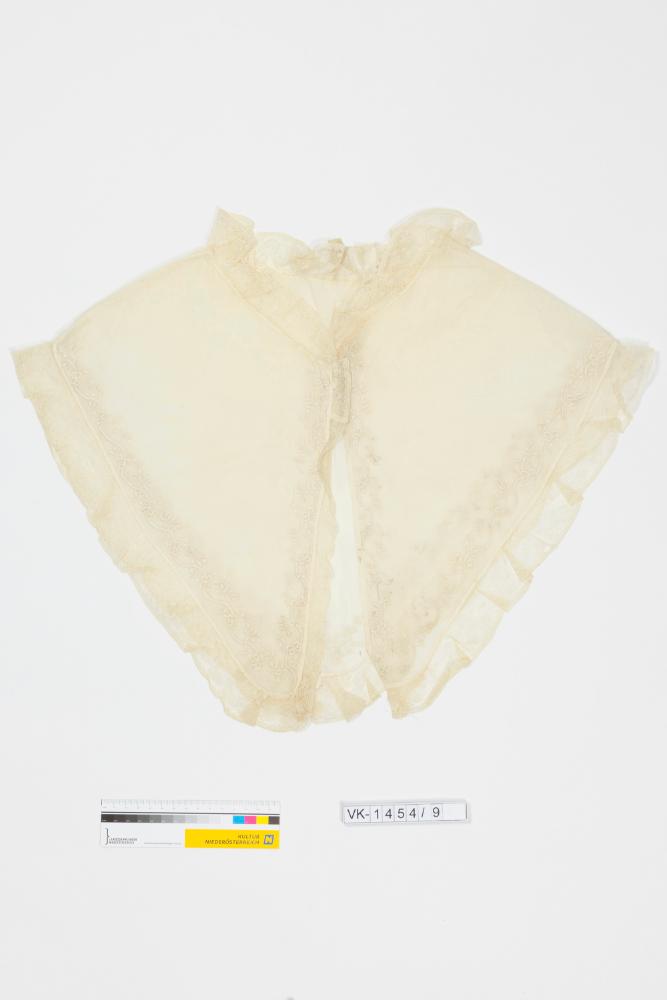 Annähernd dreieckiger weißer Kragen mit Tüllspitzenbesatz, in Weißstickerei floral verziert. Der Kragen ist auf ein rosa Seidenpapier genäht.