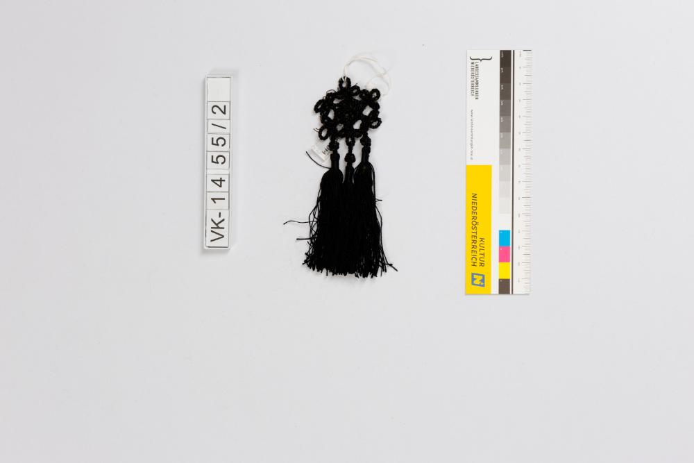 Zu einer Rosette geflochtenes, schwarzes Posamentrieband mit drei schwarzen Quasten.