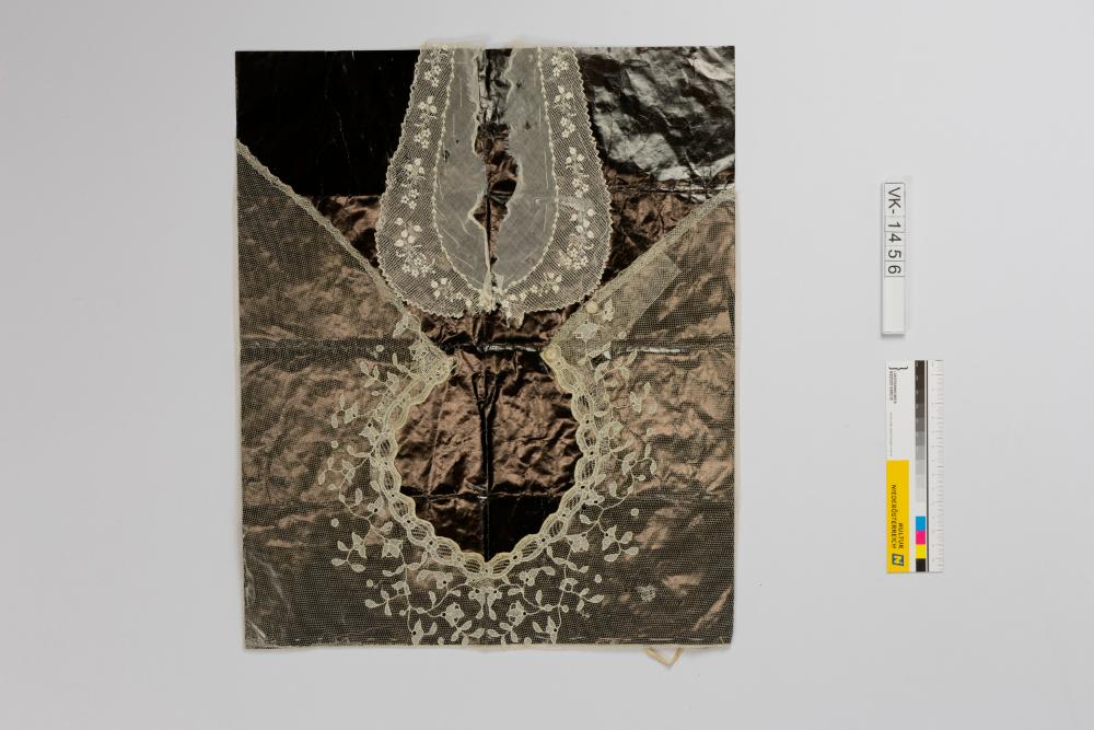 Zwei Tüllspitzenteile, auf einem glatten schwarzen Papier: Ein runder Halsausschnitt aus weißem Tüll, hinten zu knöpfen mit zwei Zwirnknöpfen, umlaufend mit floraler Tüllspannstickerei verziert. Weiters ein Spitzenkragen, rund mit Randstickerei, auf Batist genäht.