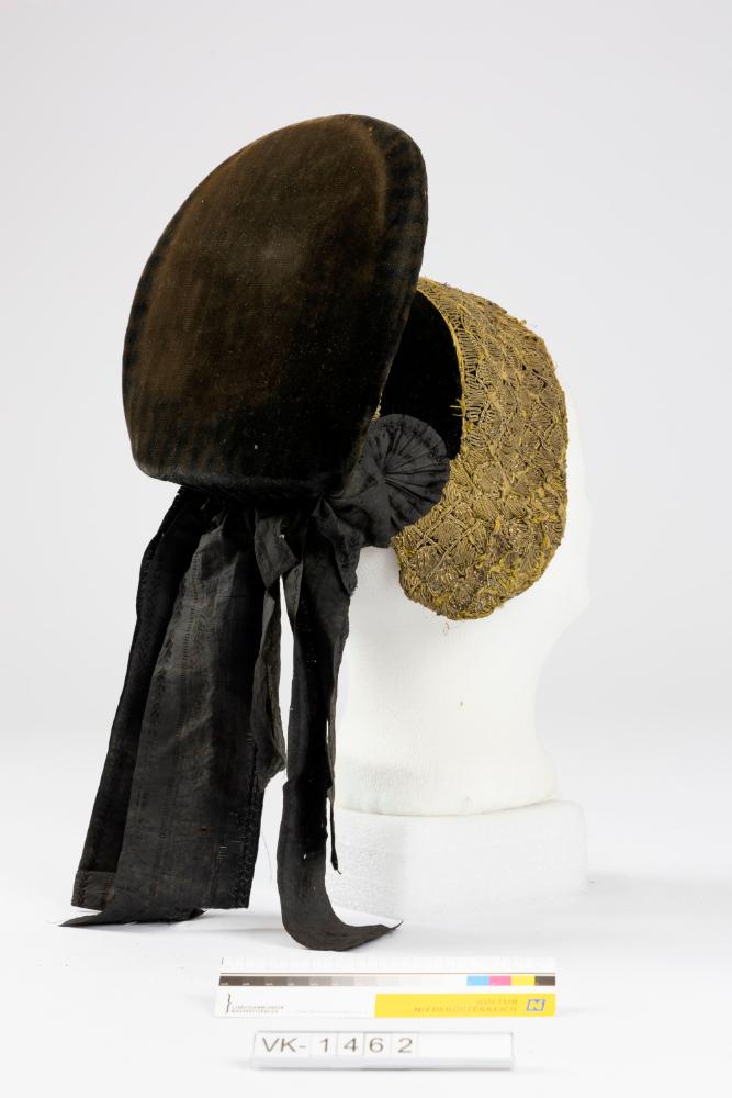 Schwarze Wachauer Haube (Brettlhaube) aus Samt, mit einer Goldborte und einer schwarzen Seidenschleife. Der Schirm ist aus Goldspitze, mit goldgelbem Stoff unterlegt, mit Drahtverstärkung. Die Haube ist mit rosa Leinenstoff gefüttert.