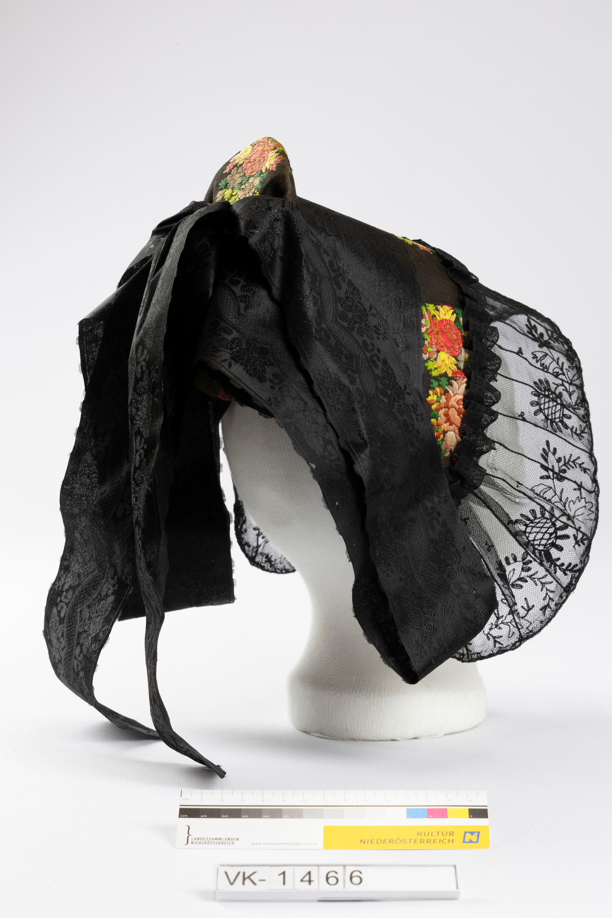 Hornputzhaube (Saurüsselhaube) aus geblümtem Brokat, mit einem schwarzen Duchesseband mit Schleife. Die Haube hat einen breiten schwarzen Tüllspitzenschirm mit Drahtverstärkung (Gimpe) und ein rot kariertes Leinenfutter.