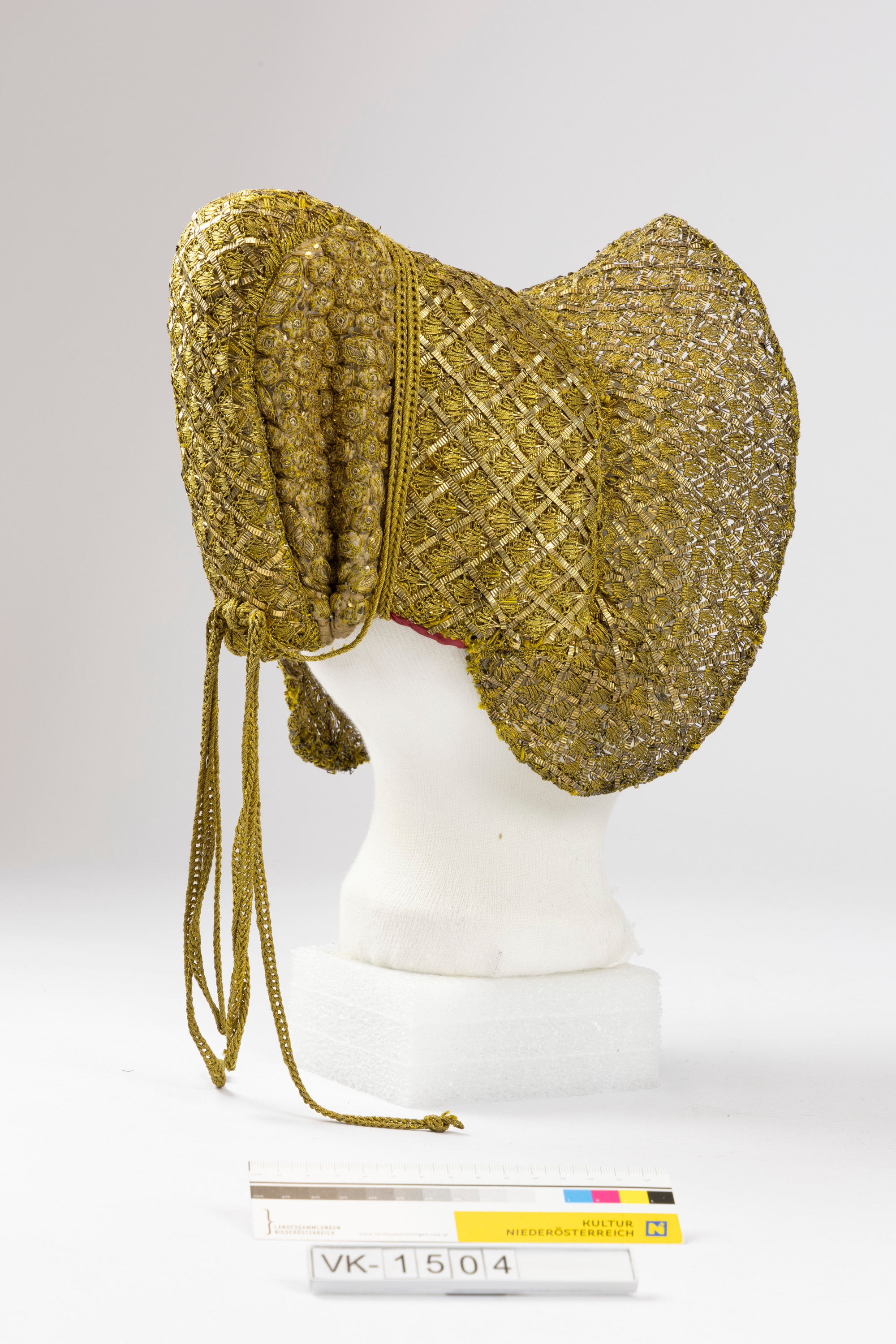 Drahtverstärkte Wiener Goldhaube mit sehr großem Schirm, vollflächig mit Goldreliefstickerei, Golddrahtspitze und Pailletten verziert. Die Haube hat einen Nackenzug mit geflochtenen Goldbändchen. Die Haube ist teilweise mit rosa und weiß gestreiftem Gradl gefüttert.