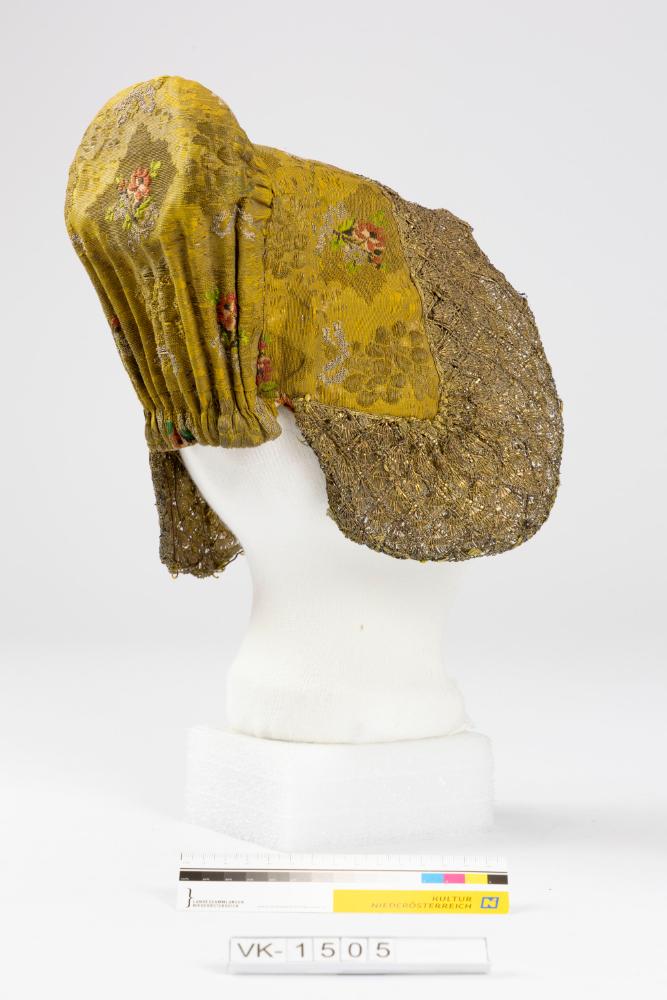 Haube aus geblümten Goldbrokat, mit drahtverstärktem Goldspitzenschirm. Die Haube hat ein kleines hufeisenförmiges Brett als Boden, formal zwischen Brettl- und Hornputzhaube. Das Futter ist aus Leinen.