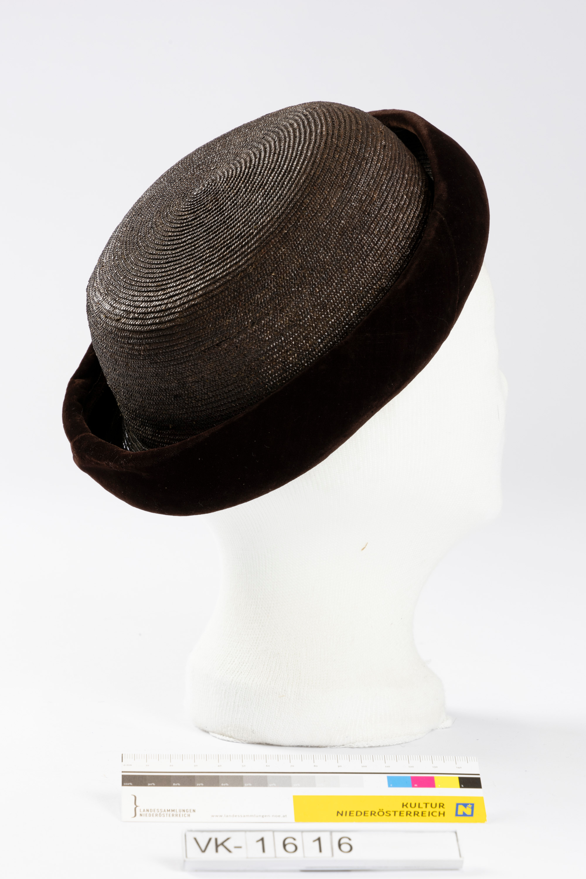 Kleiner brauner Reithut mit rundem Kopf aus Stroh, mit aufgebogener Krempe und braunem Samtfutter. Laut Inventarbuch ist das Objekt eine ehemalige Leihgabe von Helene Diamantidi.