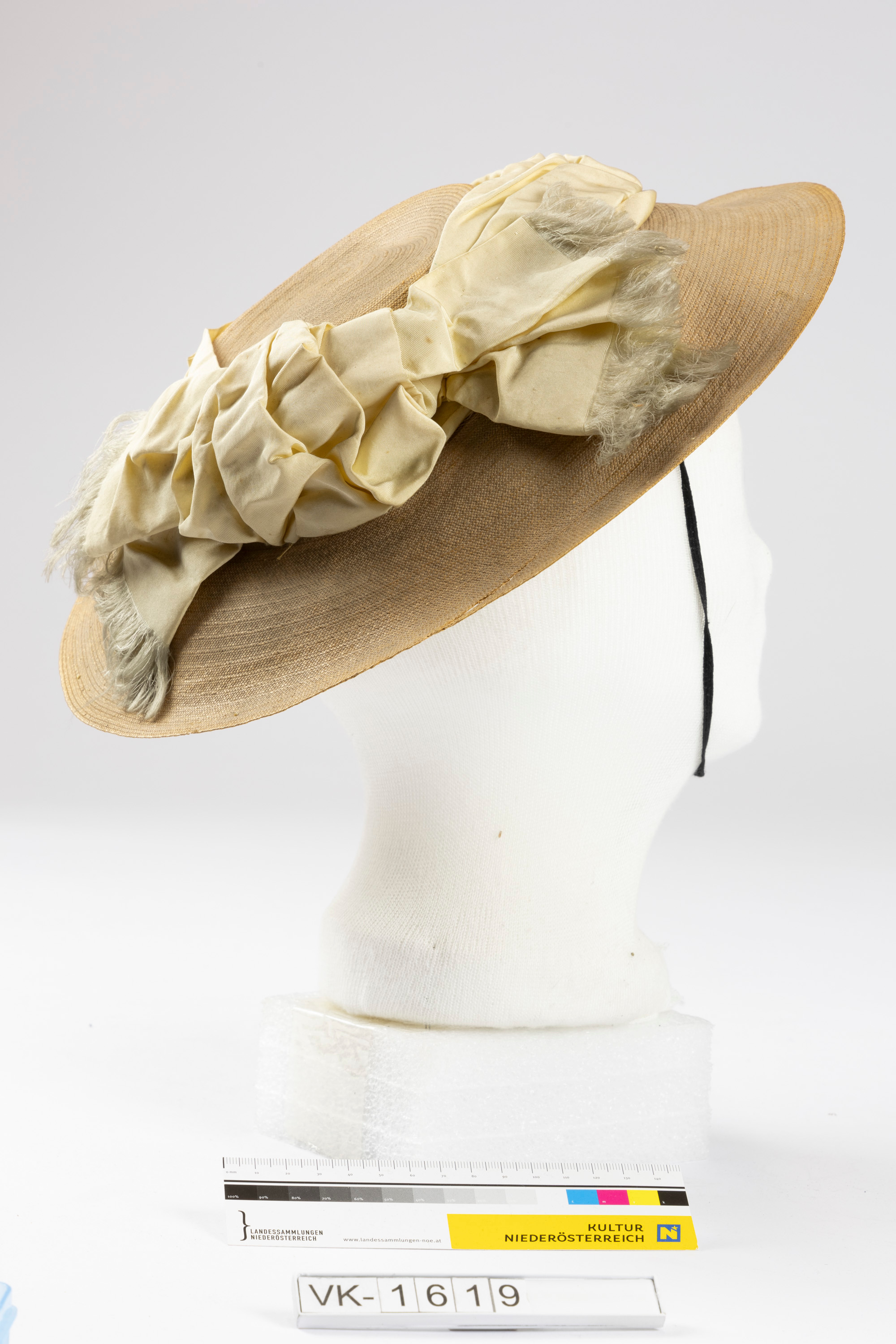 Sehr flacher brauner Mädchenstrohhut mit breiter Krempe, beigem Seidenripshutband mit großer Masche und Fransen. Laut Inventarbuch ist das Objekt eine ehemalige Leihgabe von Helene Diamantidi.