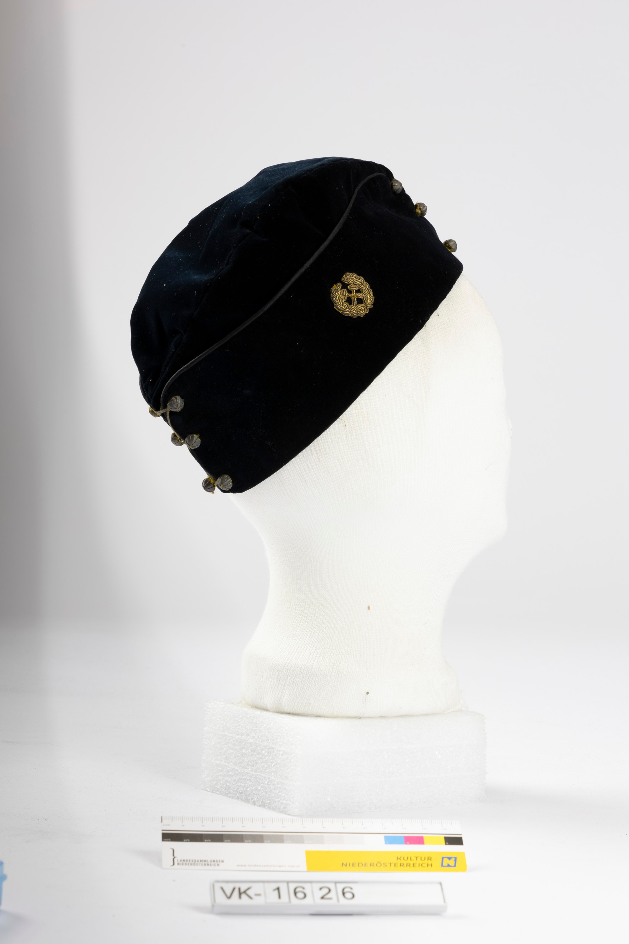 Bergknappenmütze (Schiffchen) aus schwarzem Samt, mit passepoiliertem Aufschlag. Die Mütze hat Posamentrieverzierungen in gold und silber: Vorne und hinten je sechs Silberknöpfe, auf der Seite ein bergmännisches Symbol. Im Futter hat die Mütze ein Etikett: "BERGUNIFORM-FABRIK J. SPLICHAL IN PRIBRAM".