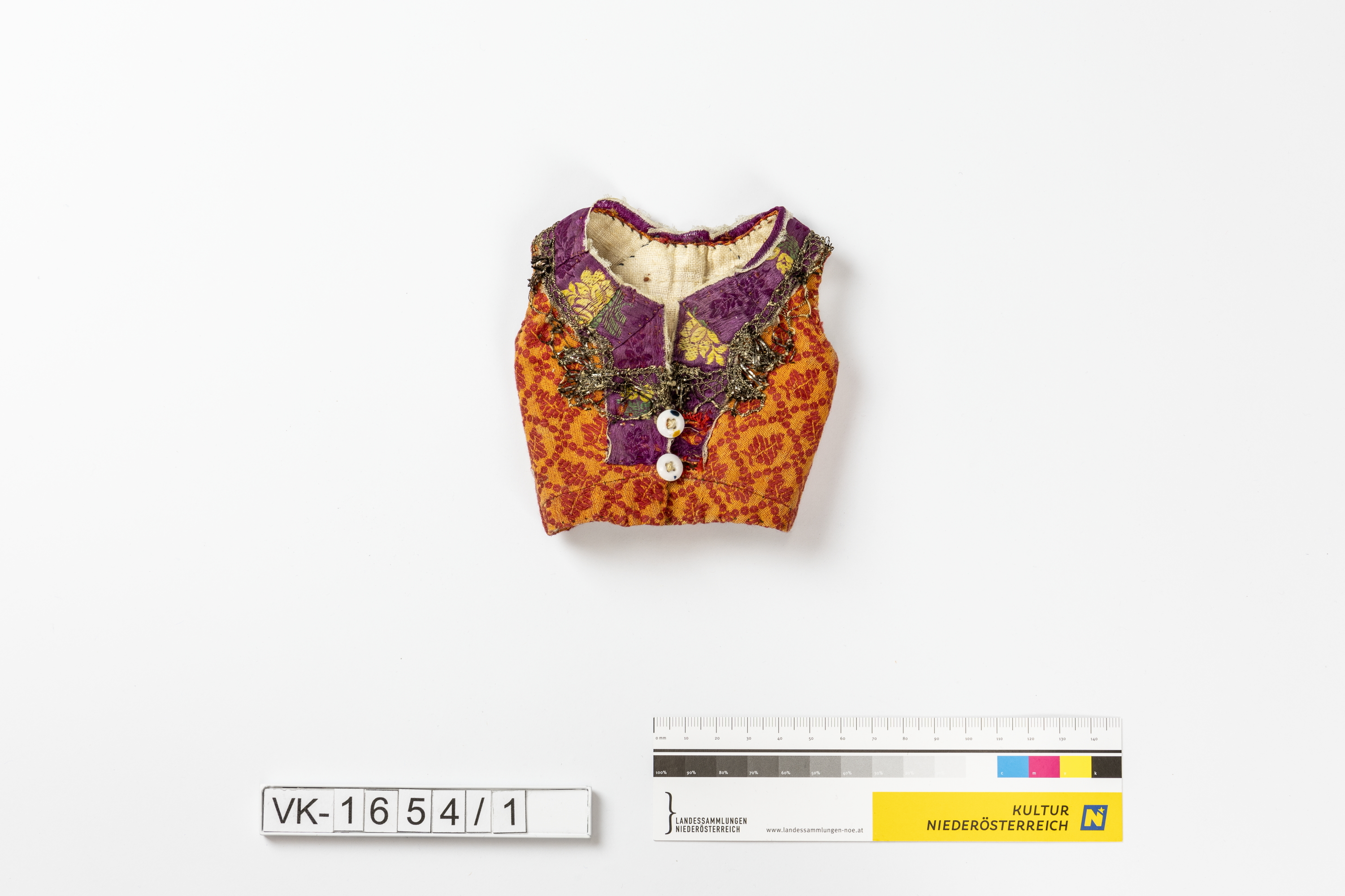 Puppenkleidung: Ärmelloses Oberteil aus orangem und violetten Brokatstoff mit zwei weißen Knöpfen und Drahtfäden.