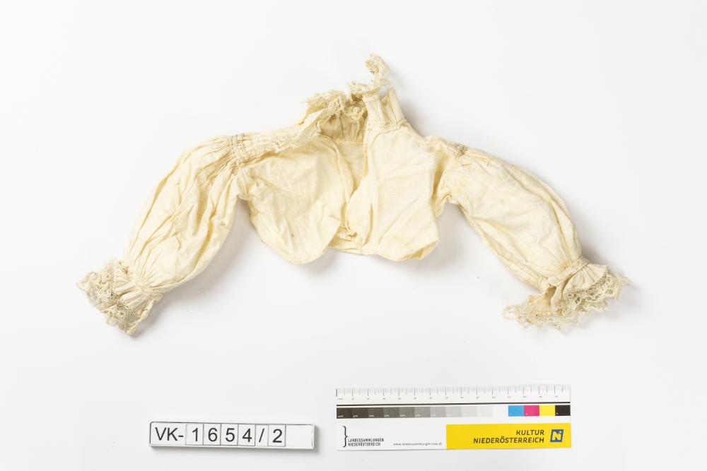 Puppenkleidung: Spitzenbesetzte weiße Bluse mit Puffärmeln.