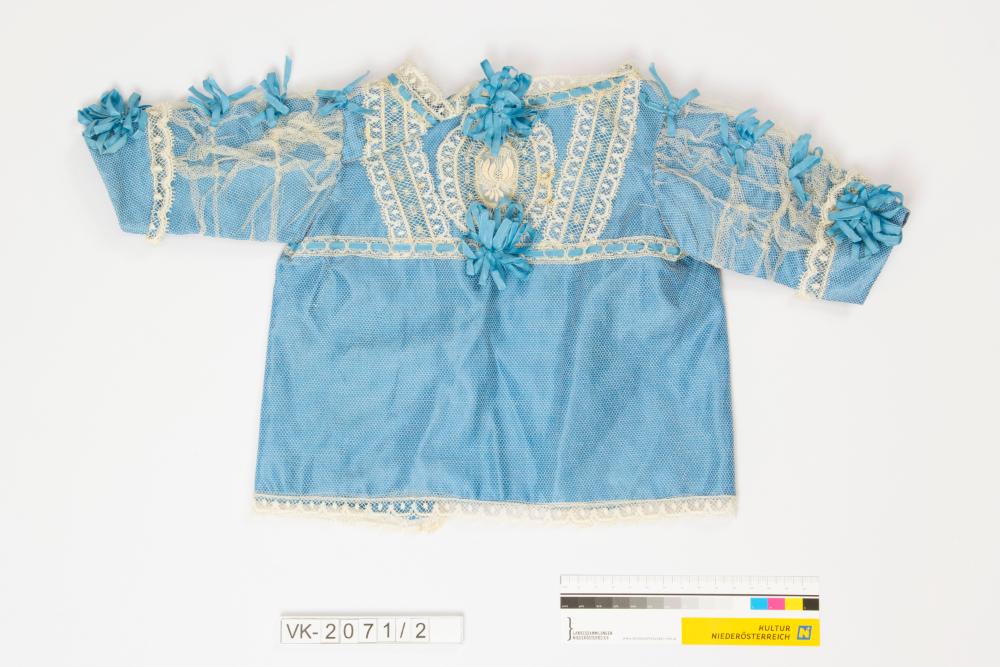 Mit weißem Tüll bezogenes, hinten zu öffnendes, blaues Taftkleidchen, verziert mit teilweise in Rüschen gelegter Tüllspitze, Weißstickerei und Maschen sowie Rosetten aus blauem Taftband.