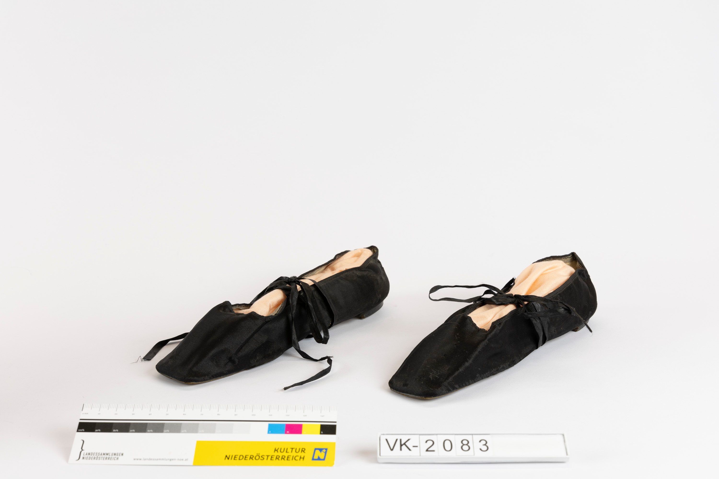 Ein Paar (a, b) flache schwarze Seidenschuhe mit schwarzen Bändern zur Schnürung über dem Knöchel und einer schmalen Ledersohle. Laut Inventarbuch handelt es sich um Tanzschuhe.