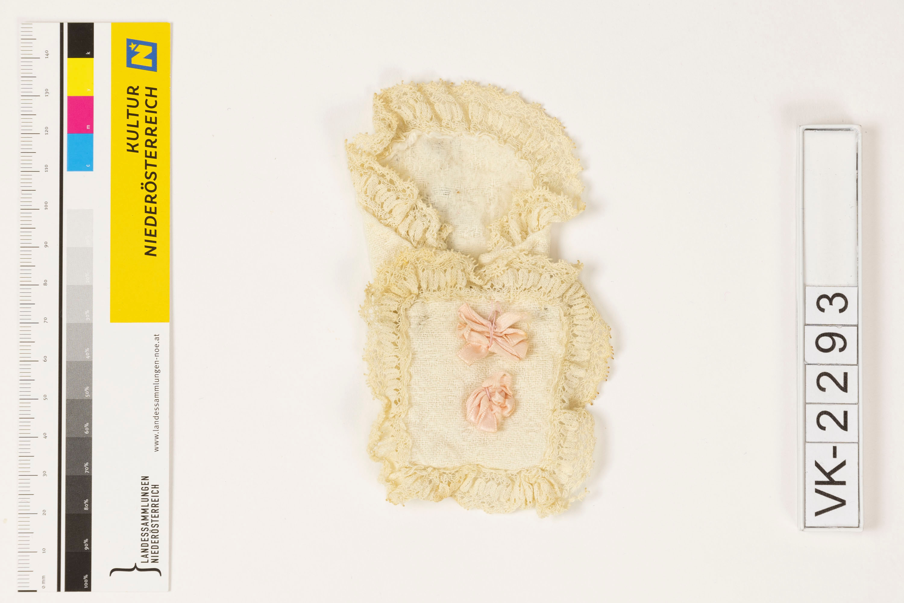 Kleiner Wickelpolster aus weißem Baumwollstoff, umlaufend besetzt mit einer Klöppelspitzenborte, an der Vorderseite verziert mit zwei rosa Maschen.