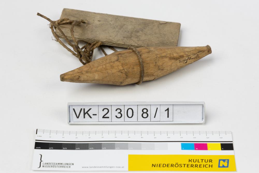 Grob geschnitzte Holzspindel mit einer daran festgebundenen Schnur.