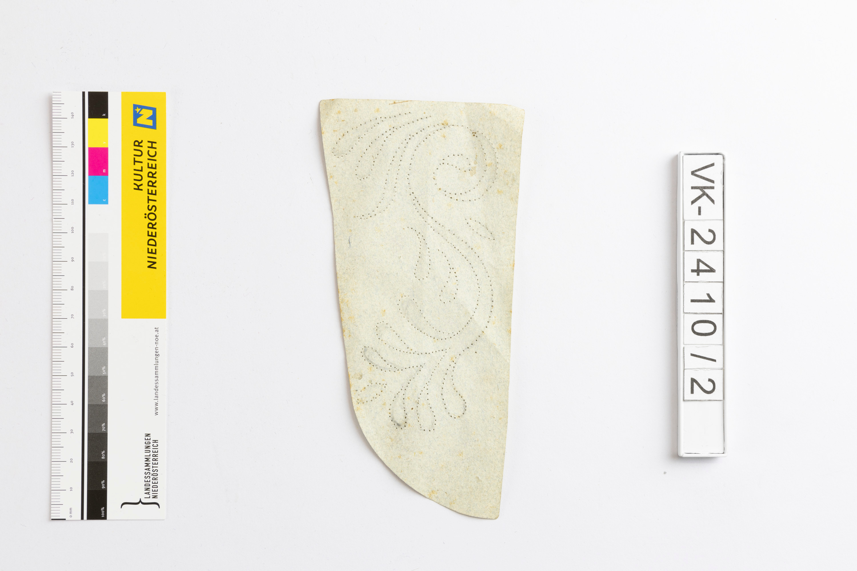 Annähernd trapezförmiges weißes Papier mit gelochten Linien. Es ist ein ornamentales Muster mit stilisiert floralen Elementen dargestellt.