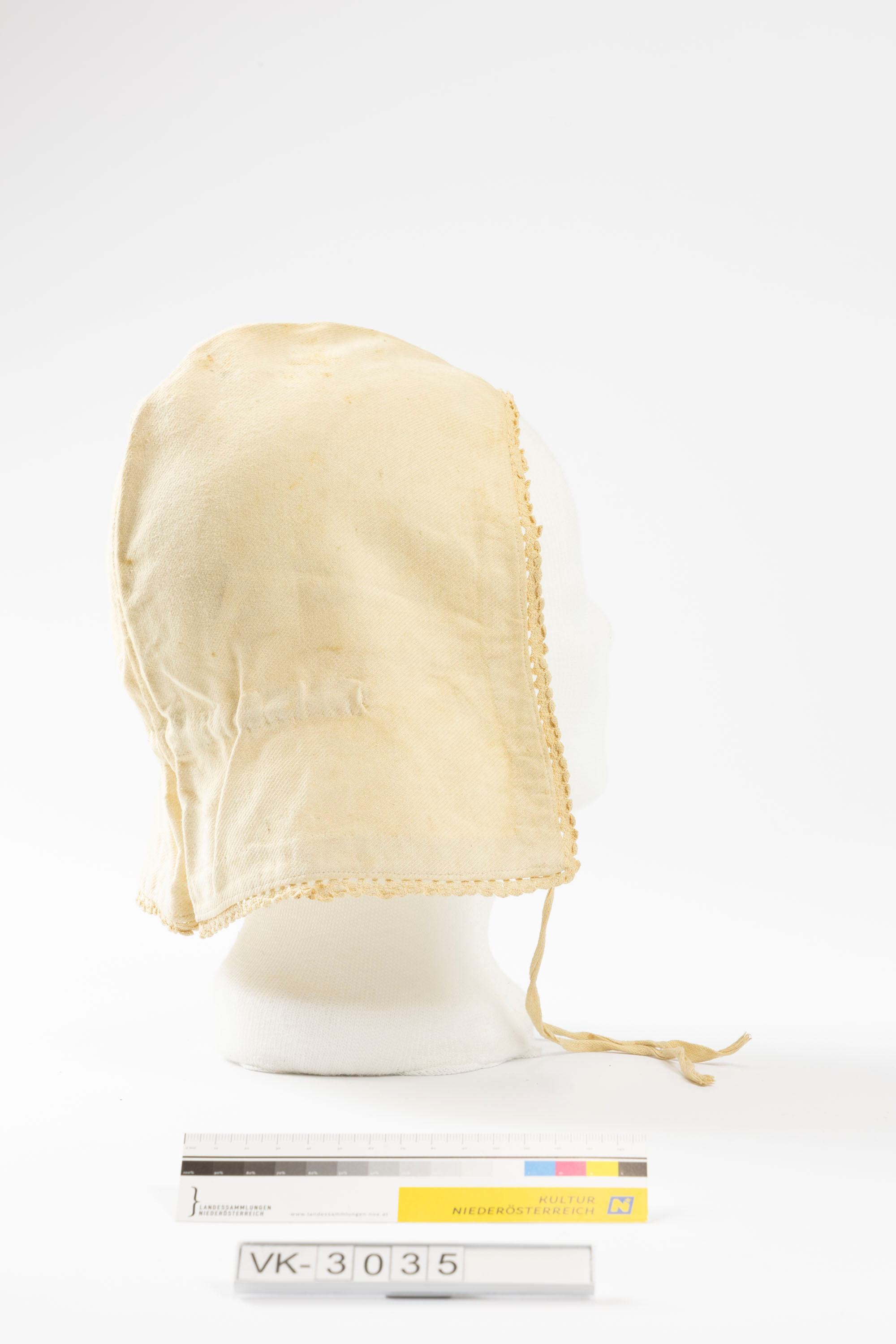 Beige Baumwollhaube mit Scheitelnaht, Nackenzug, verlängertem Halsteil und Bindebänder aus Köper. Die Haube ist mit einer Häkelborte eingefasst.