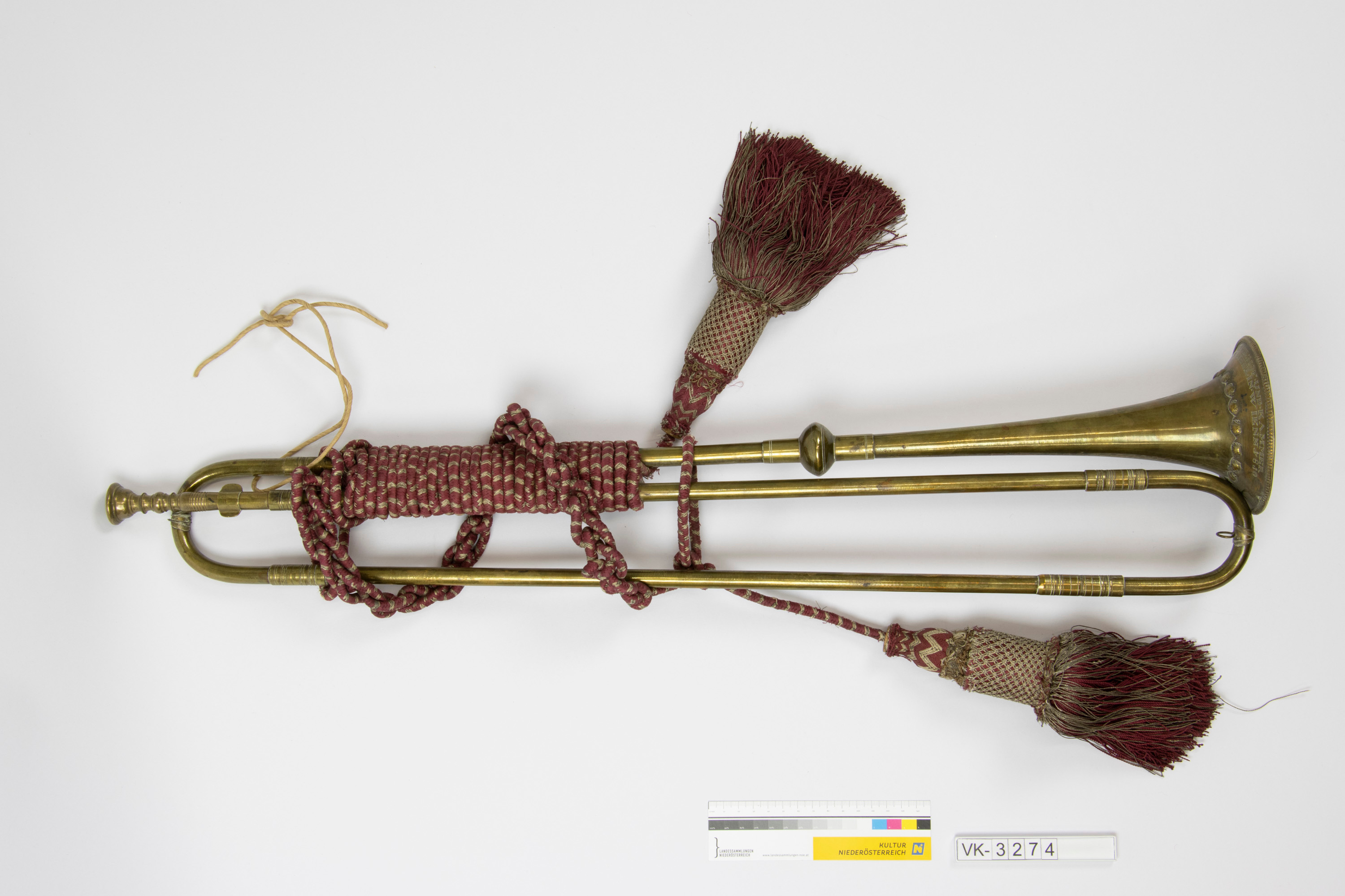 Messingtrompete (Barocktrompete) mit mehreren Zwingen und einem Knauf. Am Schalltrichter ist ein Wappen eingraviert, am Übergang zum Kranz befindet sich eine umlaufende Reihe von Muschelformen, der Kranz ist mit einer Gravur beschriftet: "ANTON UND IGNAZ KERNER K.K. PRIVIL. HOF- UND KAMMER WALDHORN- UND TROMPETENMACHER IN WIEN 1810". Die Trompete ist zum Teil mit einer rot-silbernen Kordel umwickelt, die in zwei großen Quasten endet. Objekte mit ähnlicher Verzierung (Quastenzier): VK-3271, VK-3274, VK-3276, VK-6264, VK-18462, VK-18465, VK-18999, VK-20499.