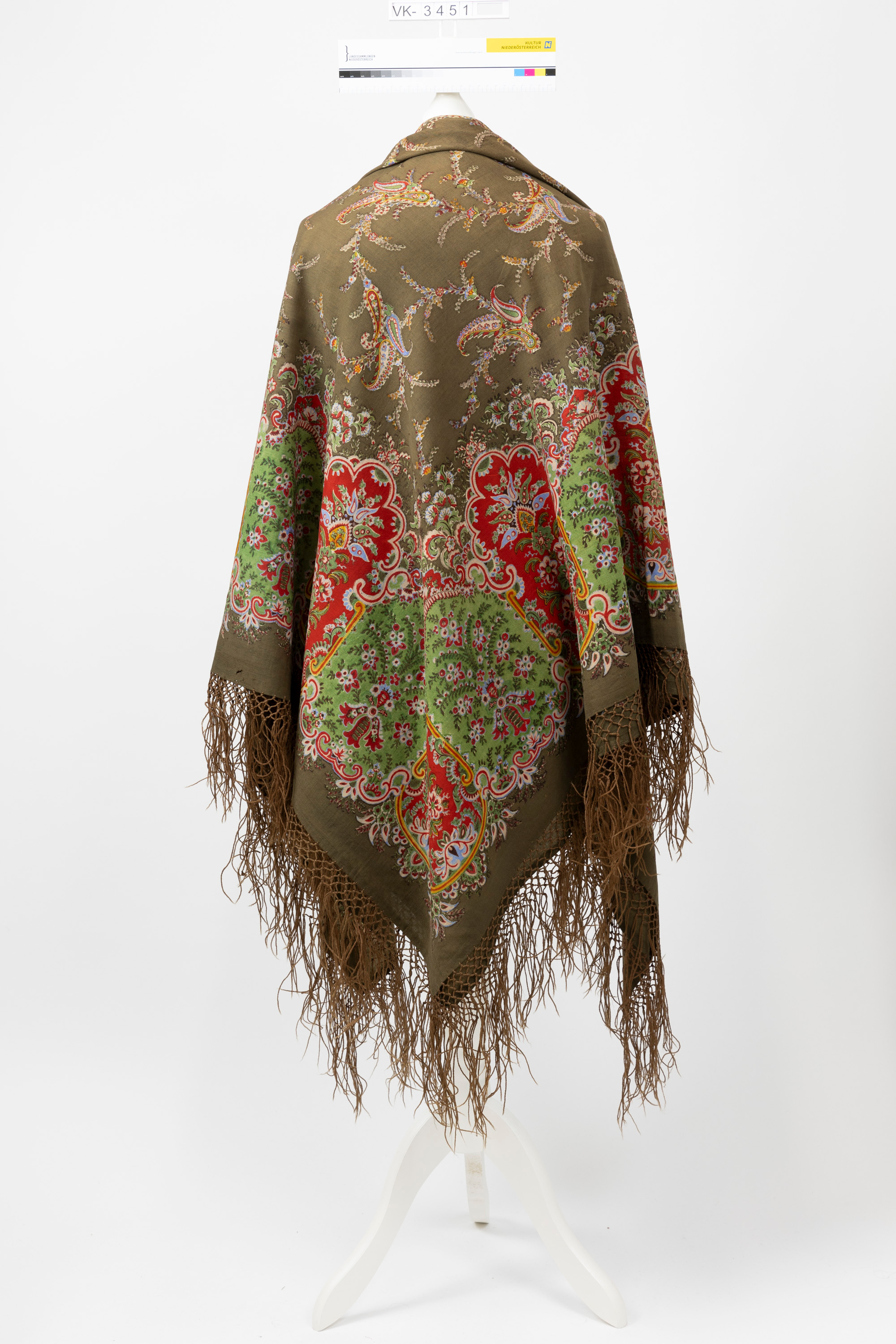 Großes Schultertuch aus olivgrünem Wollstoff mit mehrfärbigem Muster: Umlaufende annähernd rechteckige Elemente mit stilisiert floralem Dekor, im Mittelteil mehrfärbige Blütenranken und Paisleys. Die Wollfransen sind geknüpft und vernetzt.