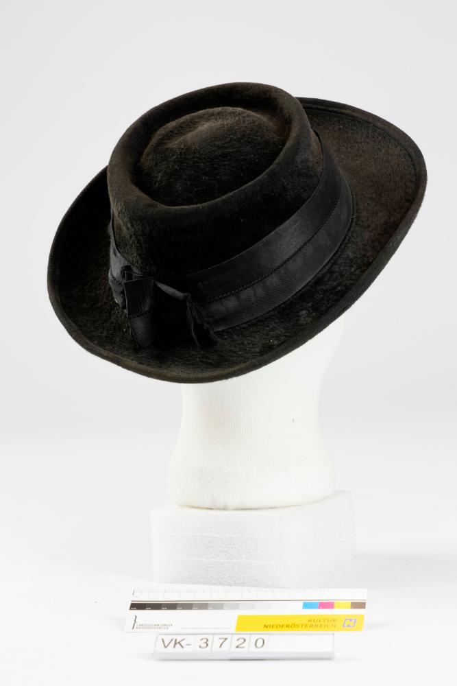 Schwarzer runder Filzhut ("Sonntagshut"), eingedrückt, mit aufgebogener Krempe und einem scharzen Rips- und Duchessehutband mit Maschenfalten. Der Hut hat ein Leinenfutter mit Aufdruck: "KARL HERNAUS Hutmacher HAINFELD".