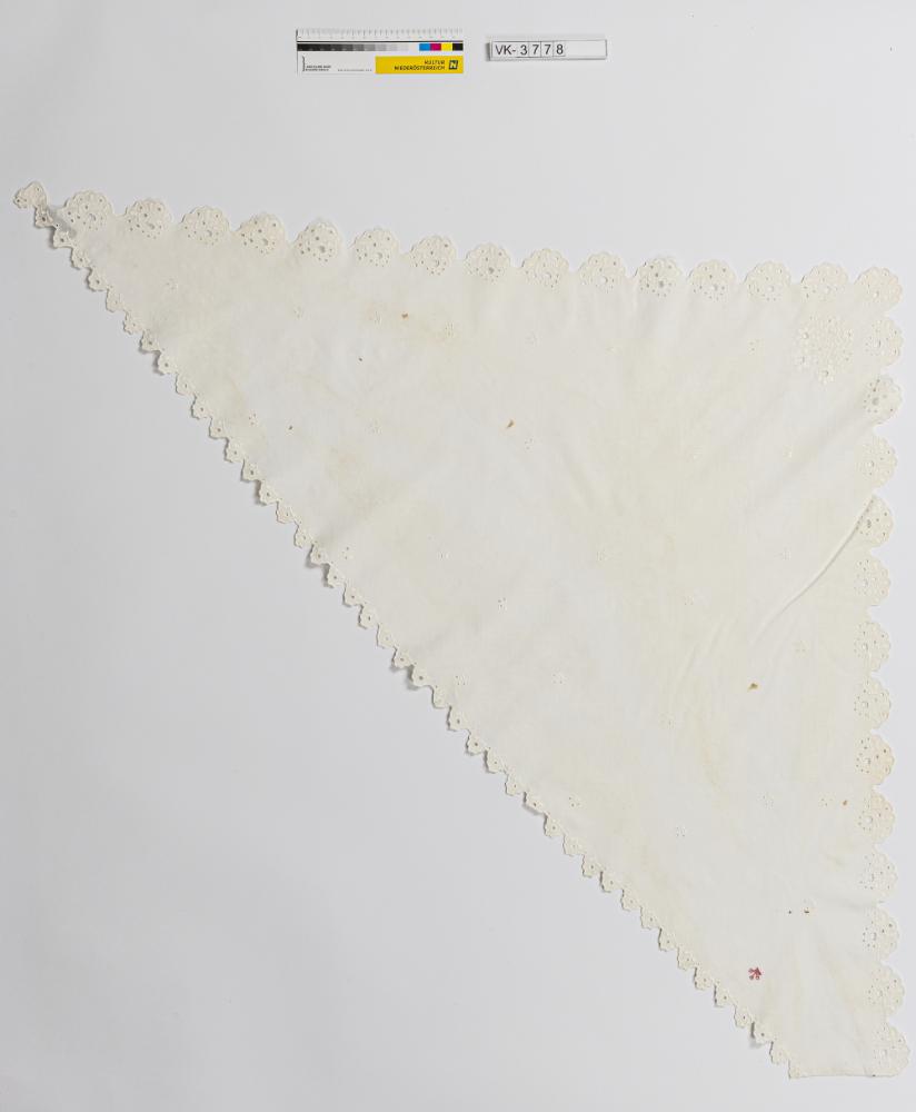 Dreickiges weißes Halstuch mit gewelltem Rand und durchbrochener Stickerei im Randbereich. Ein gesticktes Blümchen ist mit rotem Garn ausgeführt. Laut Inventarbuch wird das Tuch zur Goldhaube getragen.